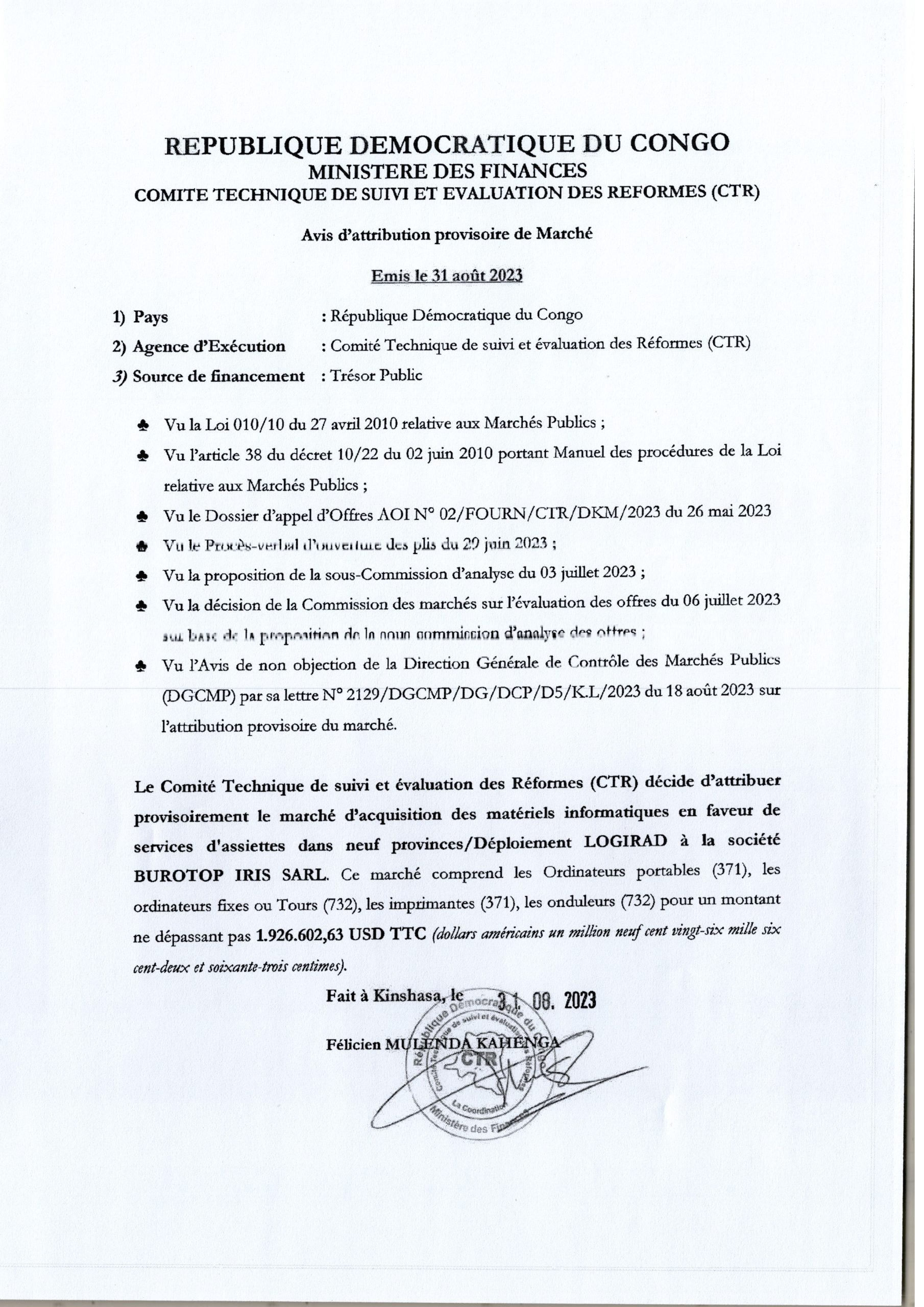 ATTRIBUTION PROVISOIRE DU MARCHÉ ACCORDÉE À LA SOCIÉTÉ BUROTOP IRIS SARL RELATIVE À L’ ACQUISITION DES MATÉRIELS INFORMATIQUES EN FAVEUR DE SERVICES D’ASSIETTES DANS NEUF PROVINCES/ DÉPLOIEMENT LOGIRAD .