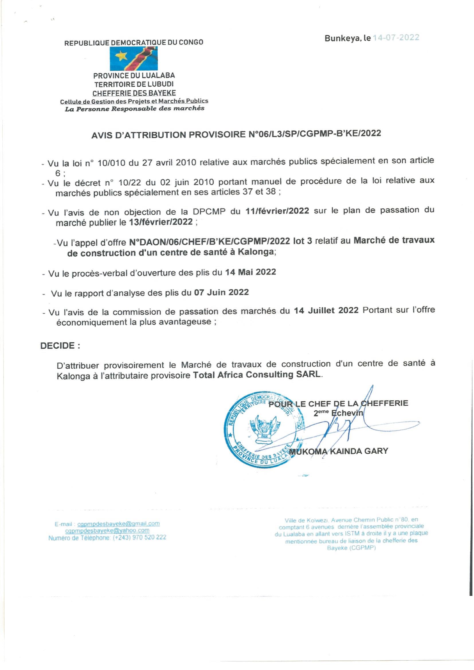 AVIS D’ATTRIBUTION PROVISOIRE DU MARCHE DE TRAVAUX DE CONSTRUCTION D’UN CENTRE DE SANTE A KALONGA ACCORDEE A TOTAL AFRICA CONSULTING SARL.