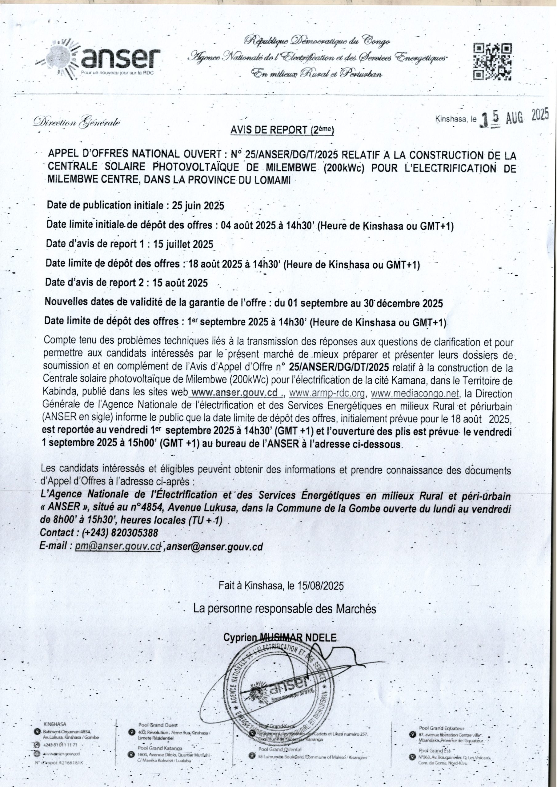 Avis de Report 2ème de la date limite de dépôt des offres, initialement prévue pour le 18 aout 2025, est reportée au vendredi 1 septembre 2025  à 15h00