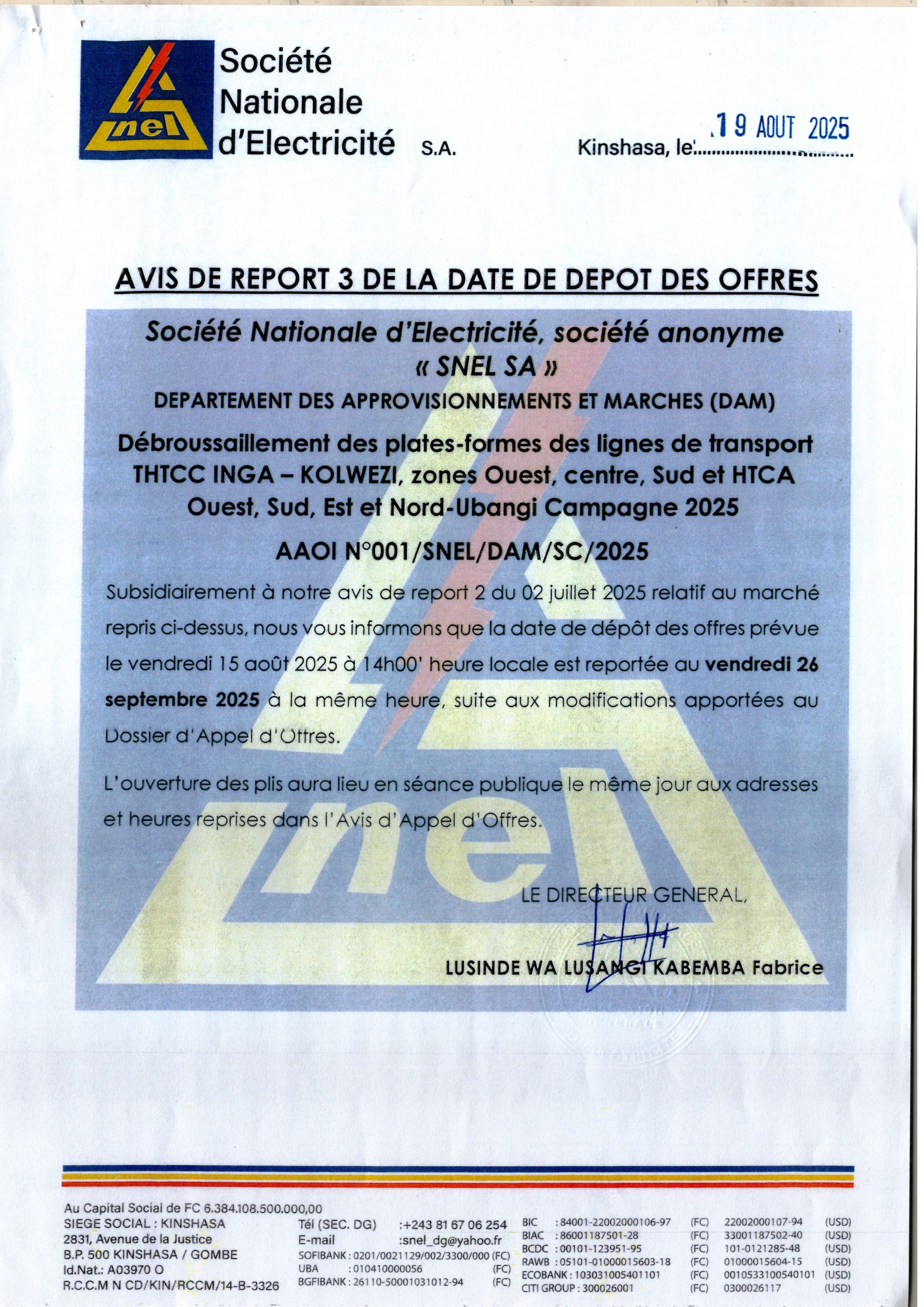 Avis de report 3 de la date de dépôt des offres, initialement prévue le vendredi 15 aout 2025 à 14h heure locale est reportée au vendredi 26 septembre 2025 à la même heure