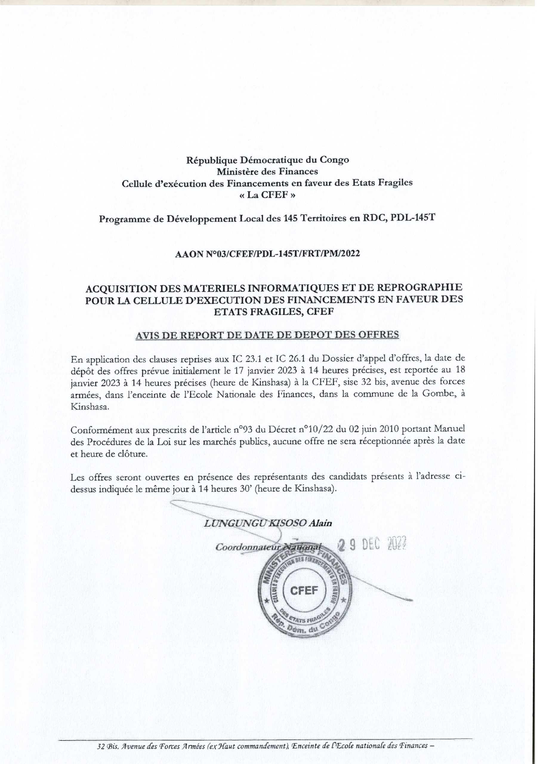 Avis de report de date de dépôt des offres pour l’Acquisition des matériels informatiques et de reprographie pour la cellule d’exécution des financements en faveur des états Fragiles, CFEF initialement le 17 janvier 2023 à 14 heures précises, est reportée au 18 janvier 2023 à 14 heures précises.
