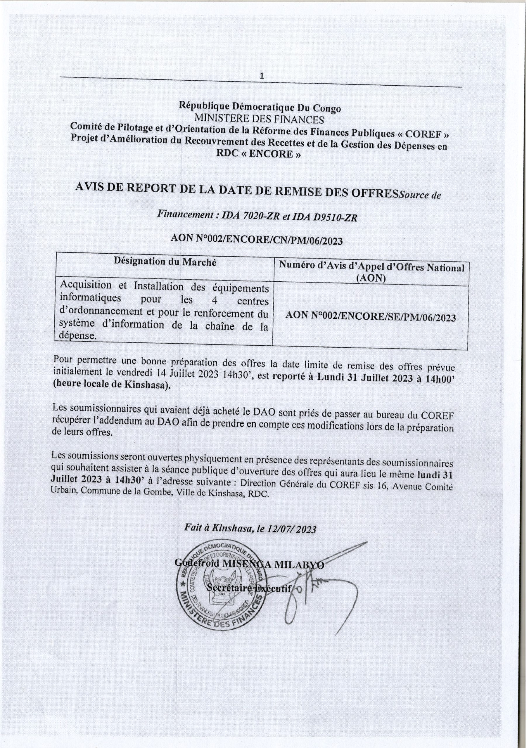 Avis de Report de la date de Remise des Offres du Ministère des Finance (COREF) relatif à l’Acquisition et Installation des équipements informatiques pour les 4 centres d’ordonnancement et pour le renforcement du système d’information de la chaine….