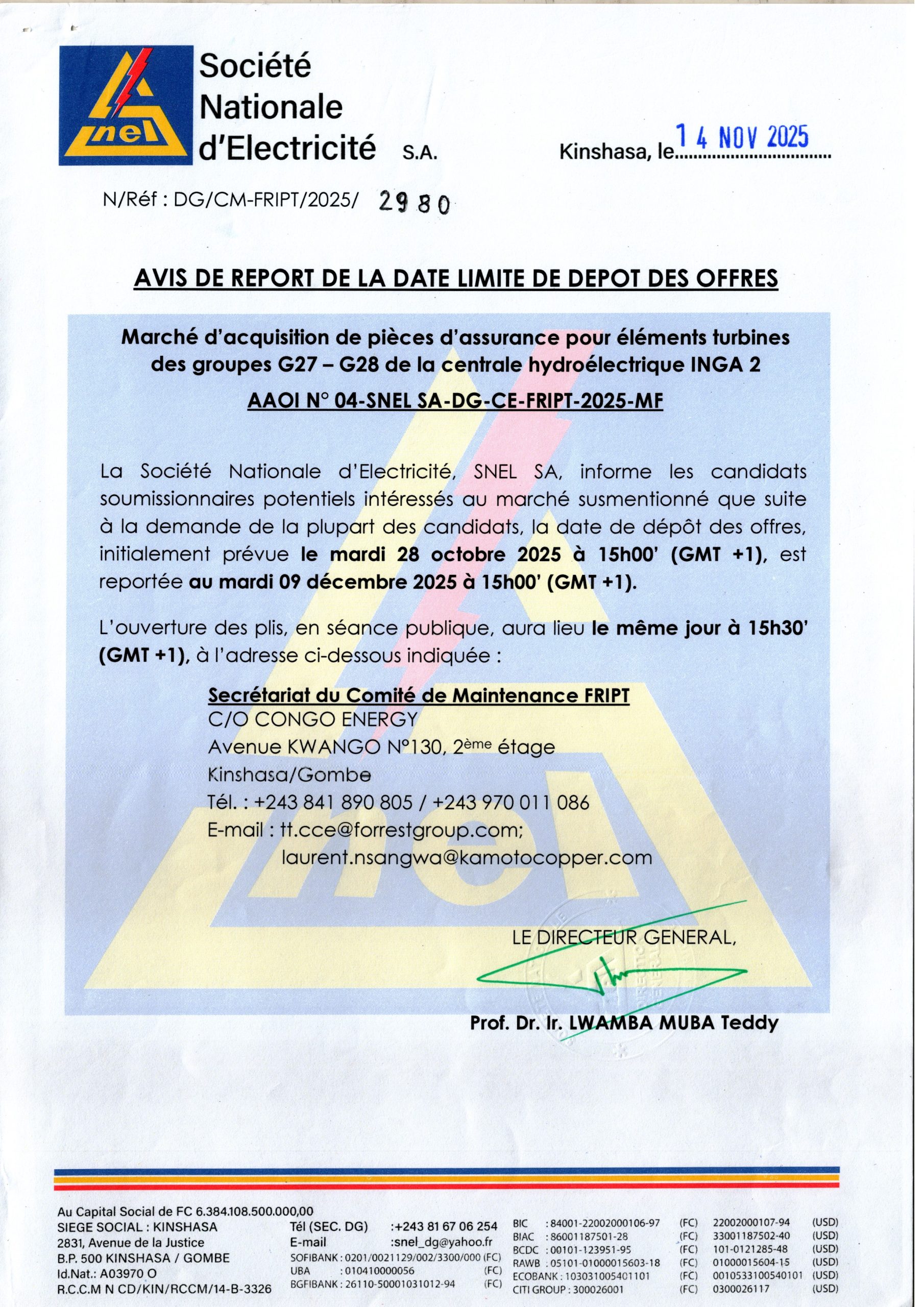 Avis de report de la date limite de depôt des offres relatif au marché d’acquisition de pièces d’assurances pour éléments turbines des groupes G27-G28 de la centrale hydroélectrique INGA 2.