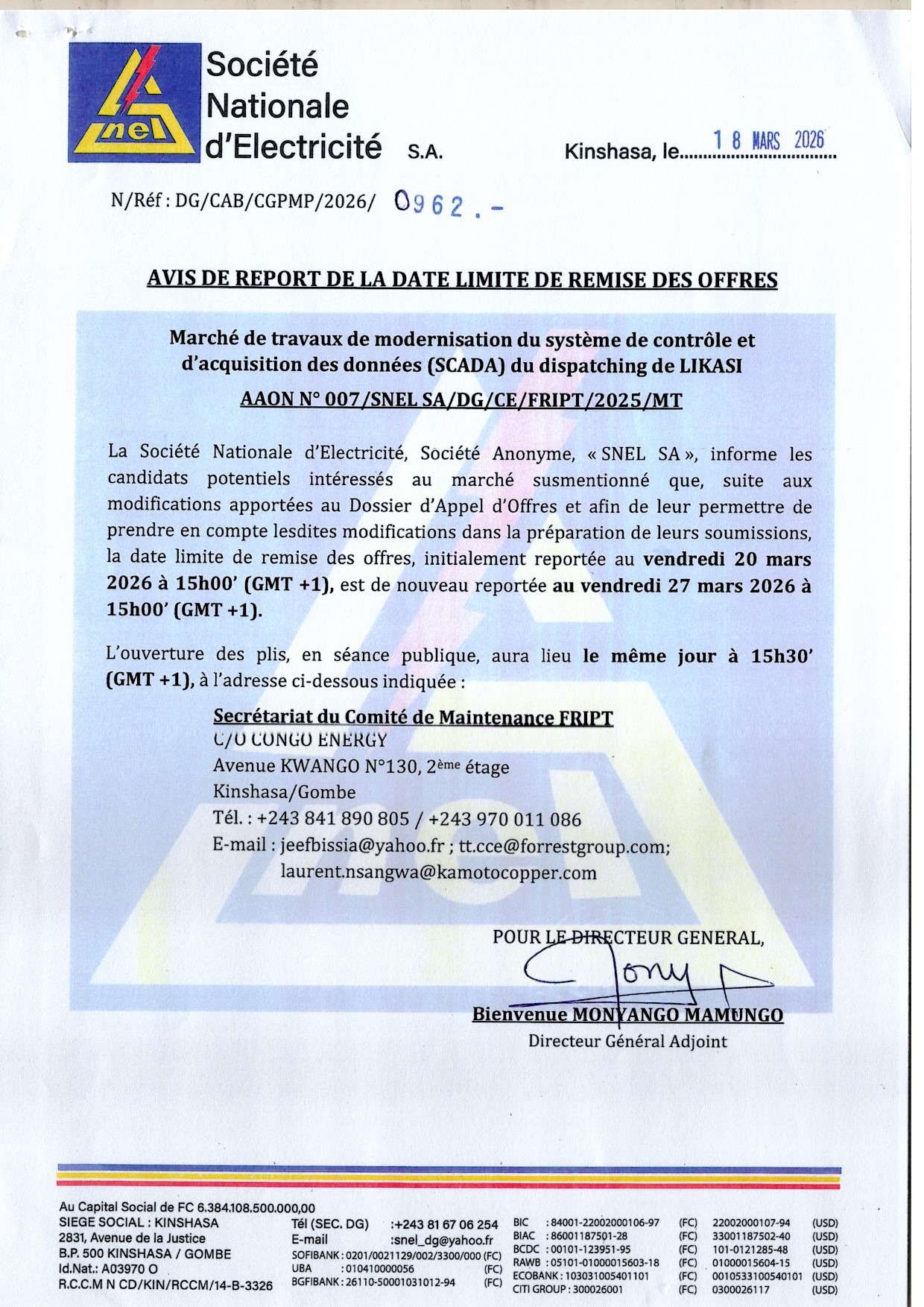 Avis de Report de la date limite de remise des offres relatif aux Travaux de modernisation du système de contrôle et d’acquisition des données (SCADA) du dispatching de LIKASI