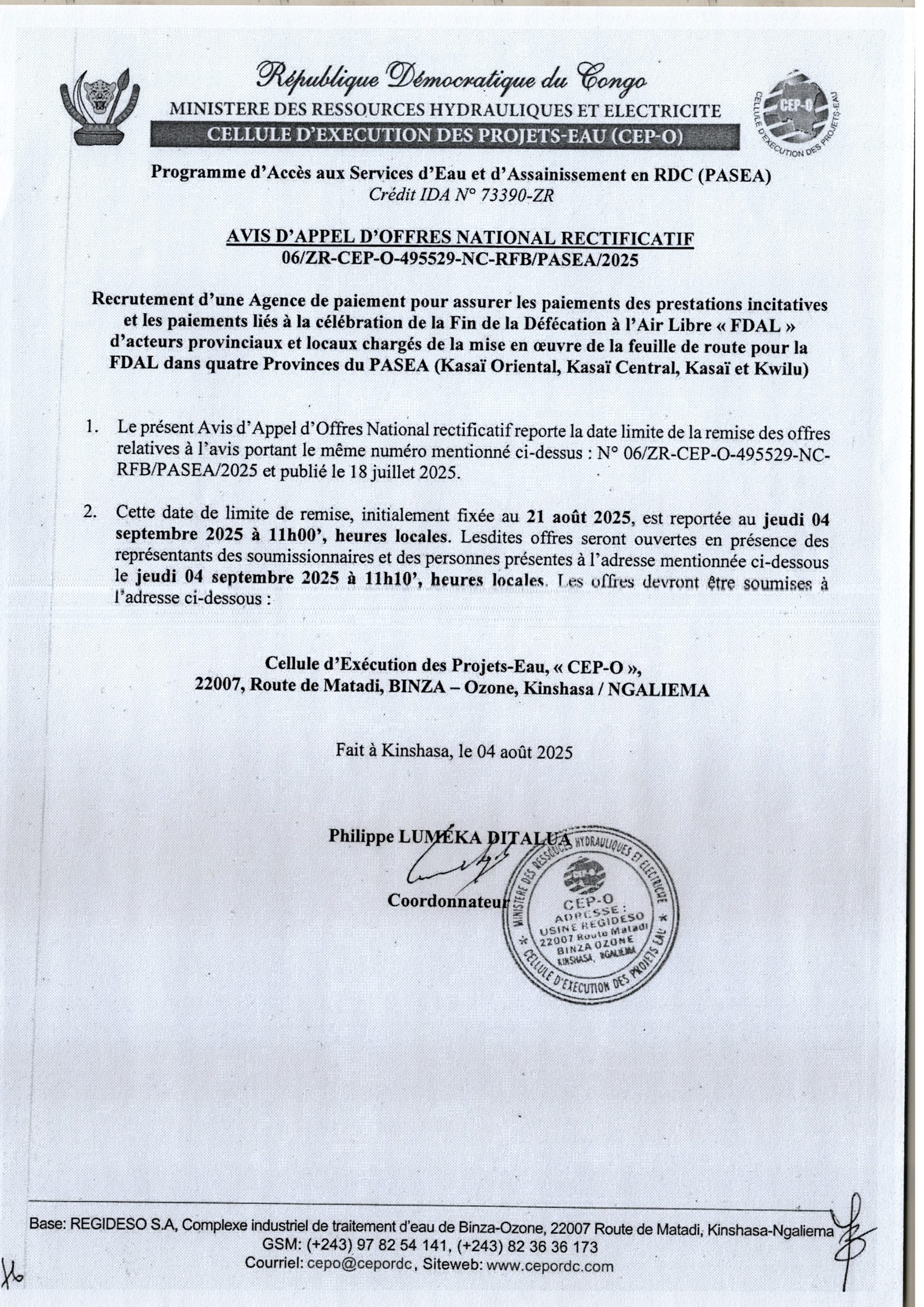 Avis de report de la date limite des offres, initialement fixée au 21 aout 2025, est reportée au jeudi 04 septembre 2025 à 11hoo (heure locale)