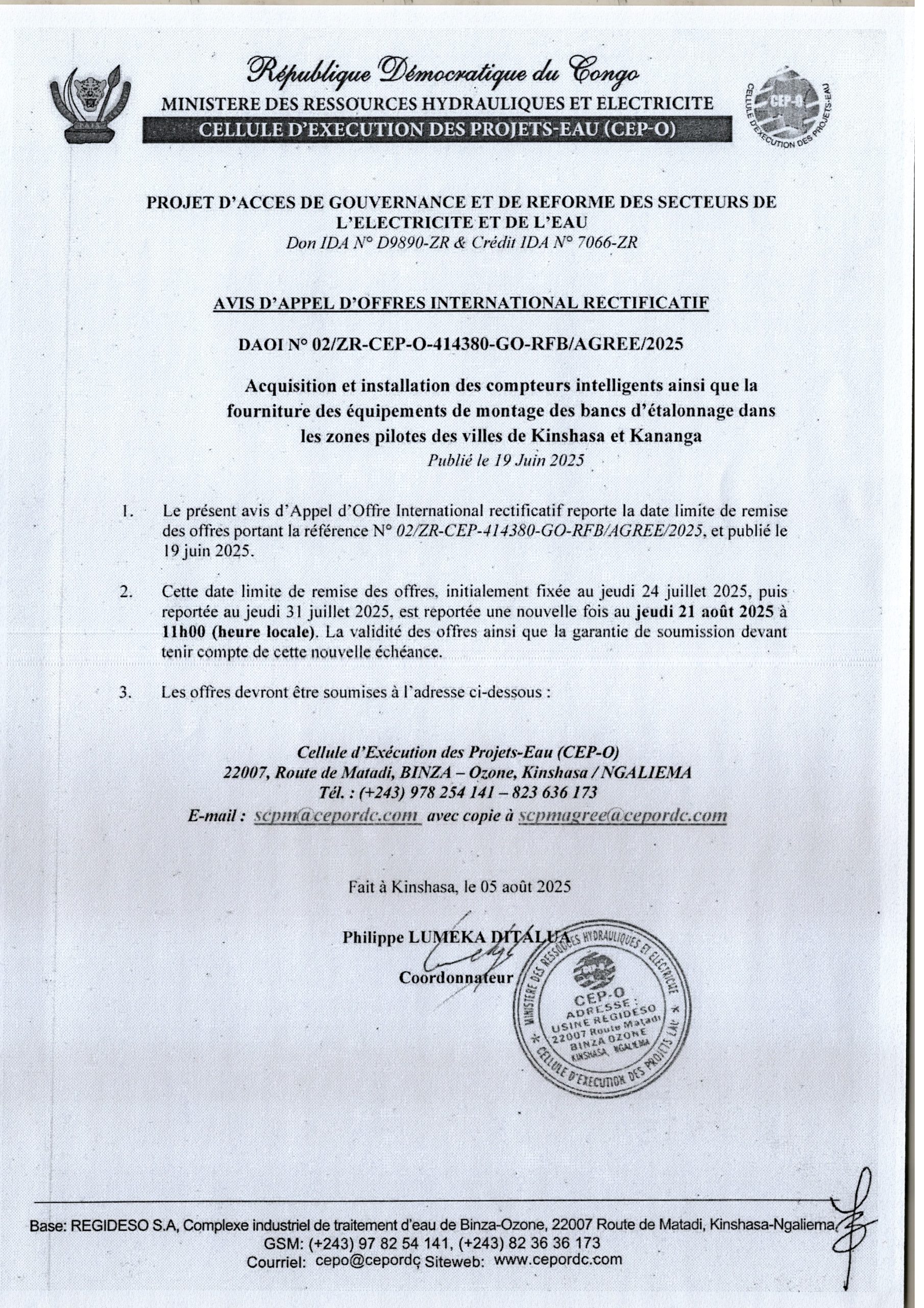 Avis de report de la date limite des offres, initialement fixée au jeudi 24 juillet 2025, puis reportée au jeudi 31 juillet 2025, est reportée une nouvelle fois au jeudi 21 aout 2025 à 11hoo (heure locale)