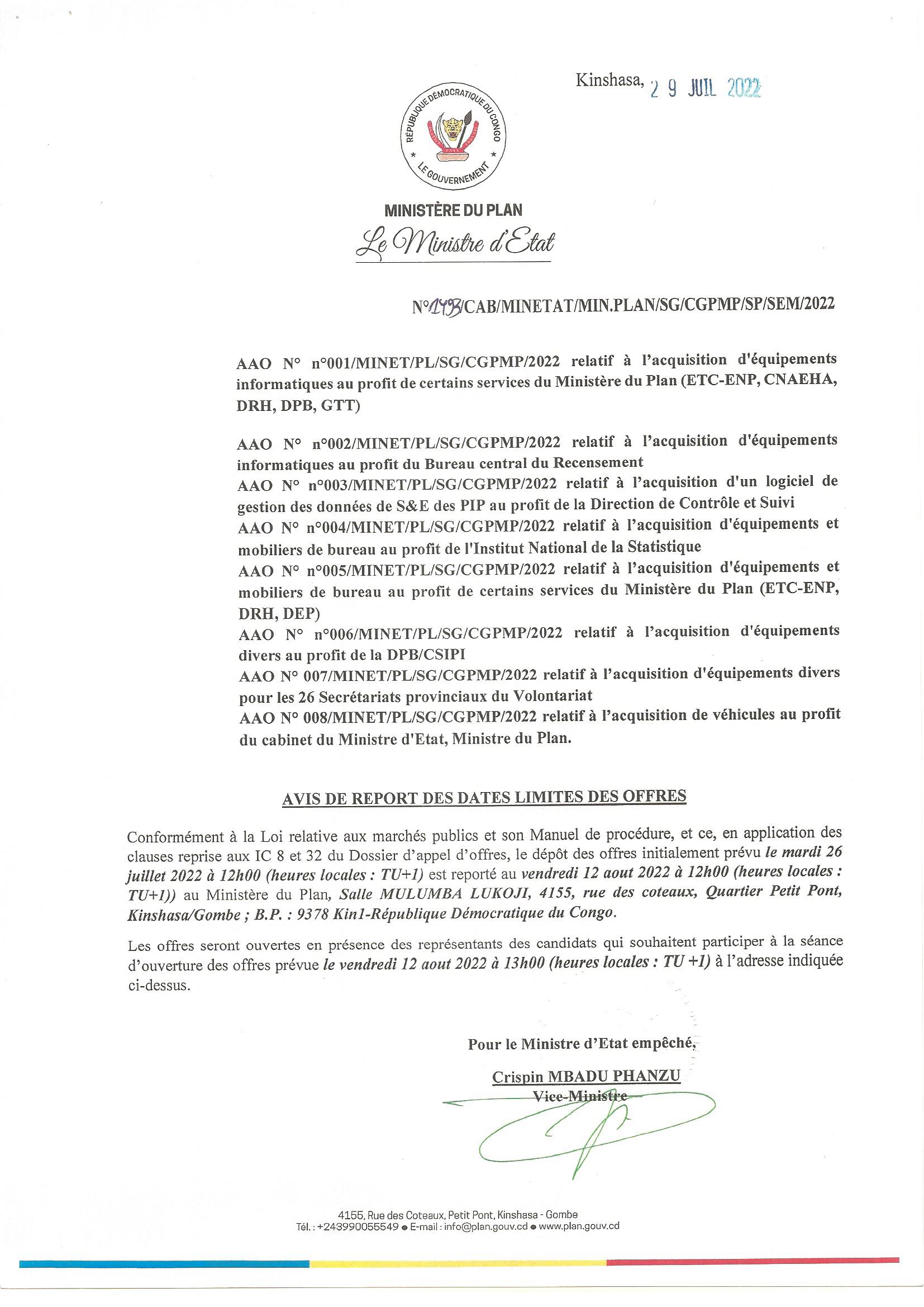 Avis de report des avis d’appel d’offre national n° 001, 002, 003, 004, 005, 006, 007 et 008 relatif à certaines acquisitions.