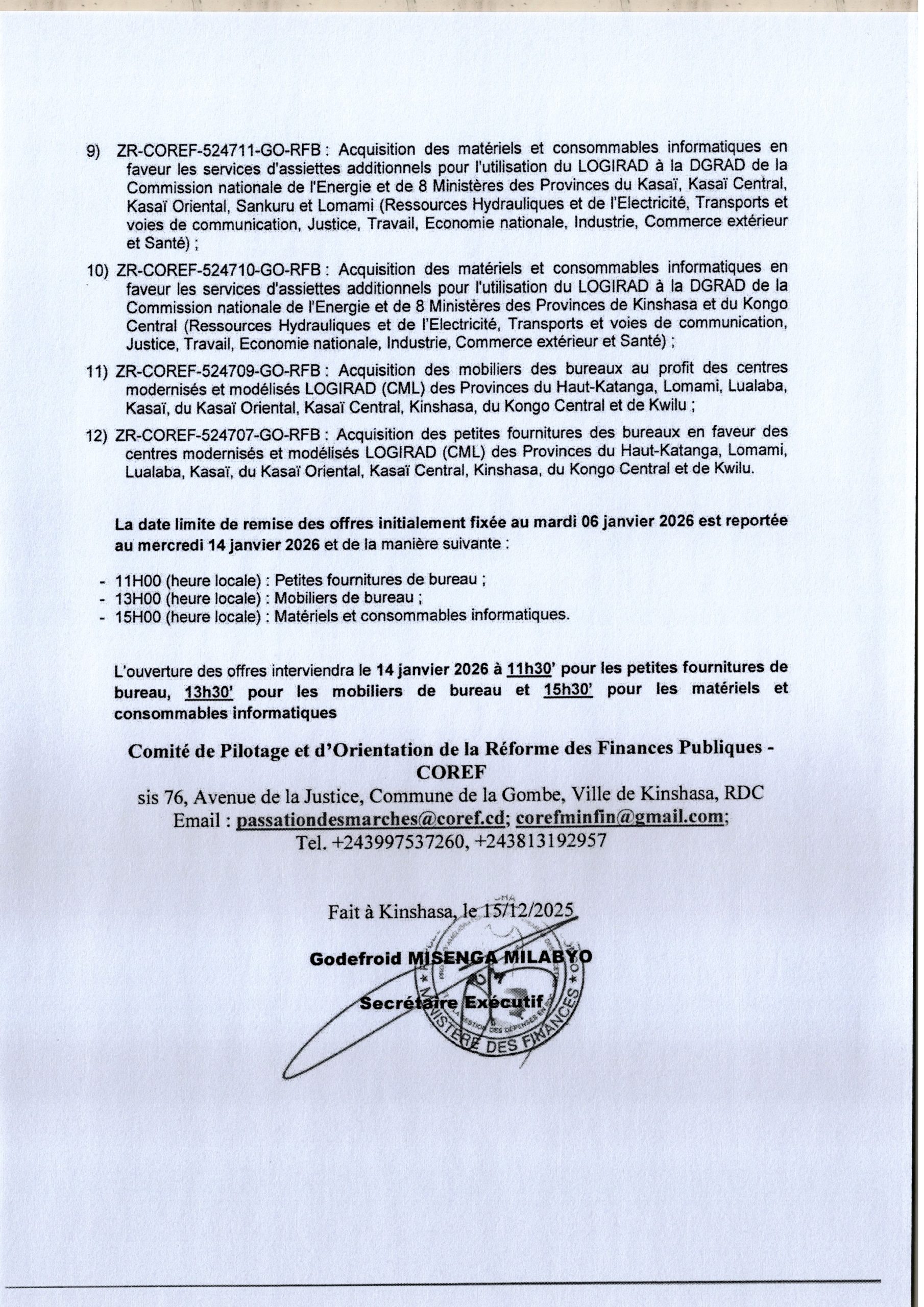 Avis de report du marché relatif à l’acquisition des mobiliers et équipements de bureaux en faveur des Institutions du Ministère des Finances.
