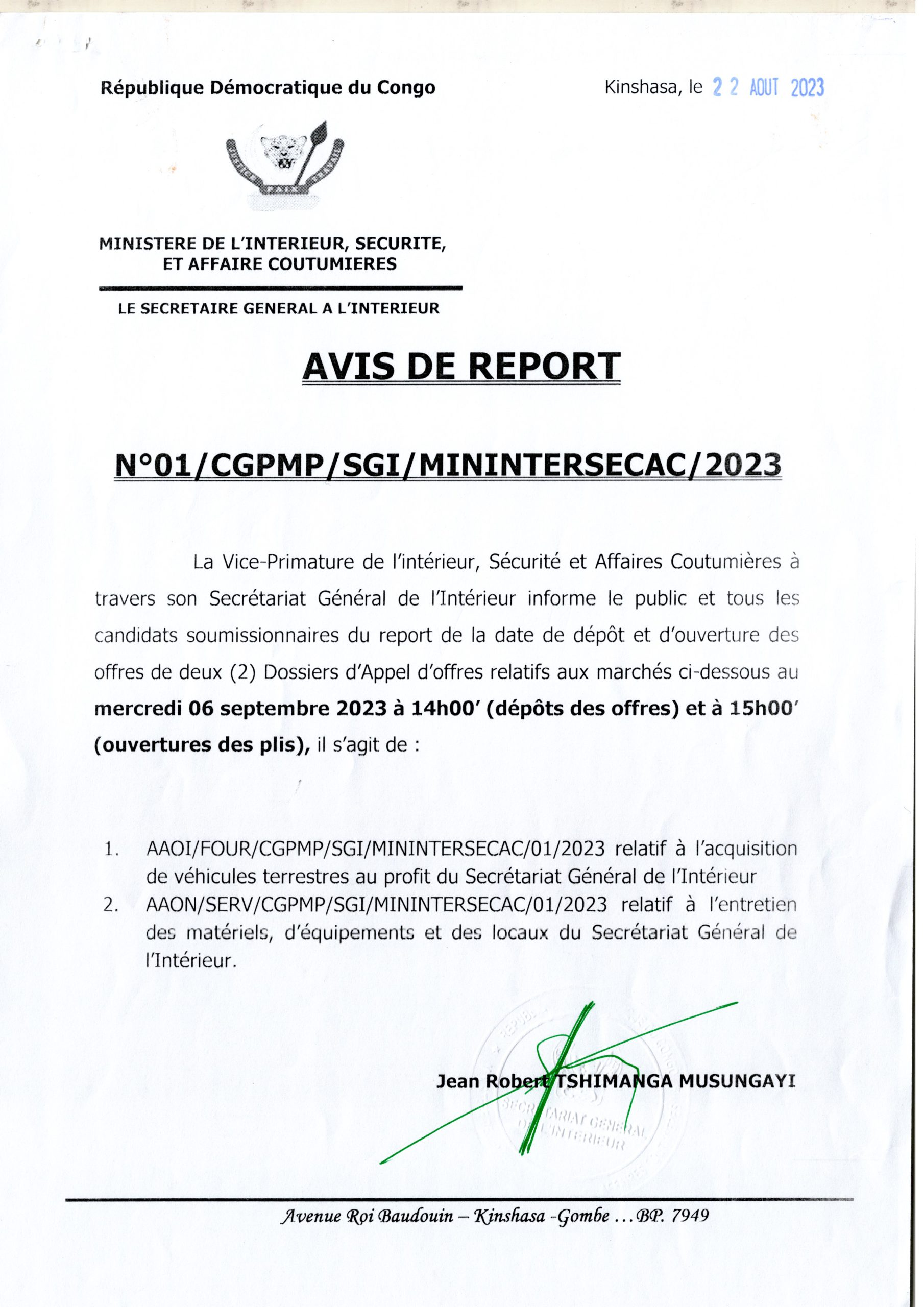 Avis de report du Ministère de l’Intérieur, Sécurité, et Affaire Coutumières relatif à l’acquisition de véhicules terrestres au profit du Secrétariat Général de l’Intérieur
