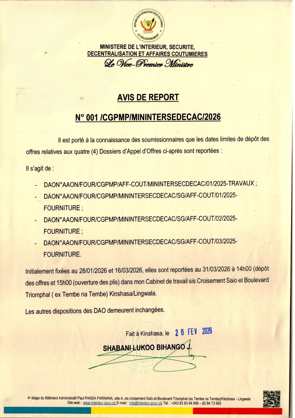 Avis de Report du Ministère l’Intérieur, Sécurité, Décentralisation et Affaires Coutumières (MININTERSEDECAC) relative aux Dossiers d’Appel d’Offres marché des fournitures.