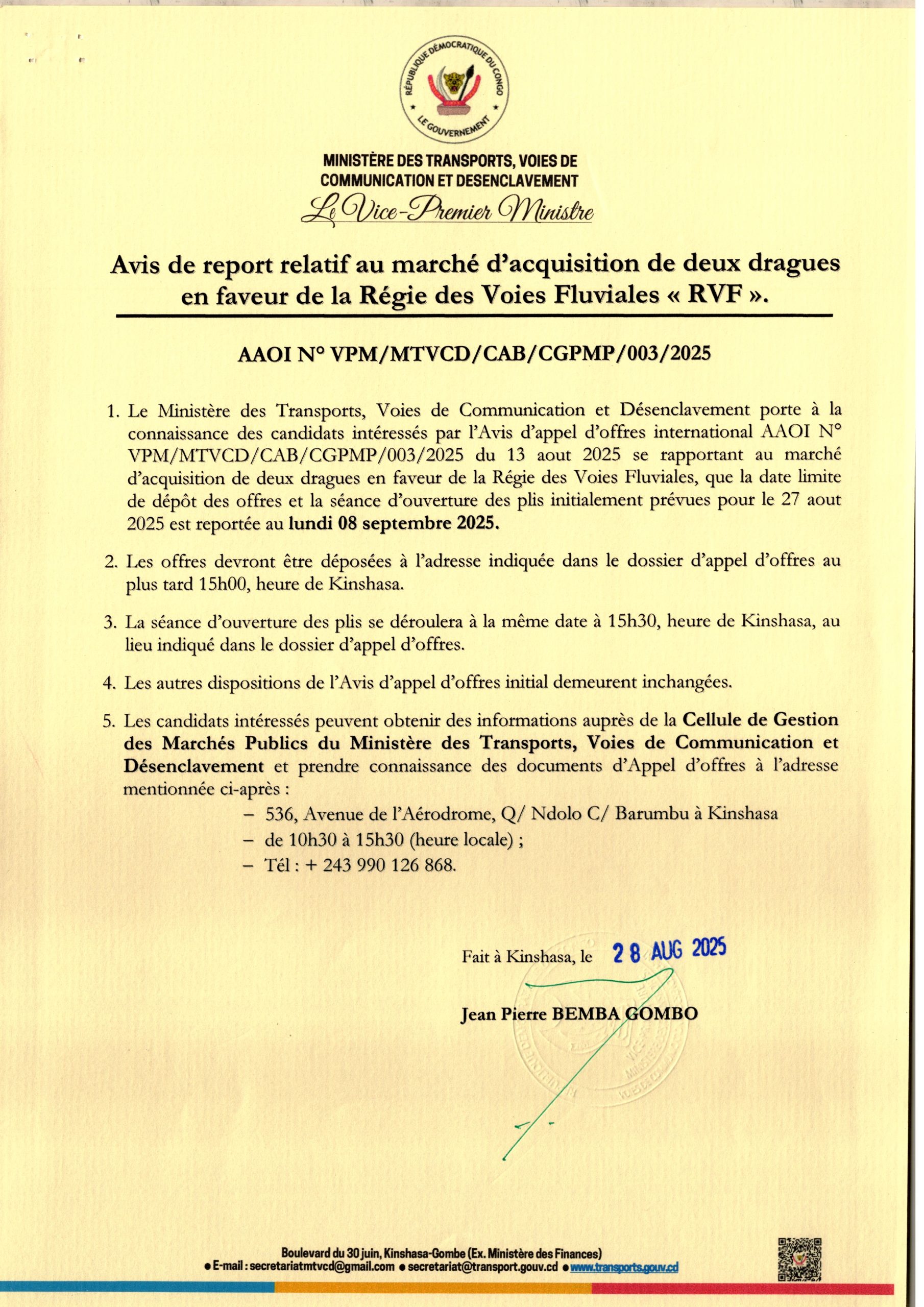 Avis de report relatif au marché d’acquisition de 2 (deux) dragues en faveur de la Régie des Voies Fluviales “RVF”.