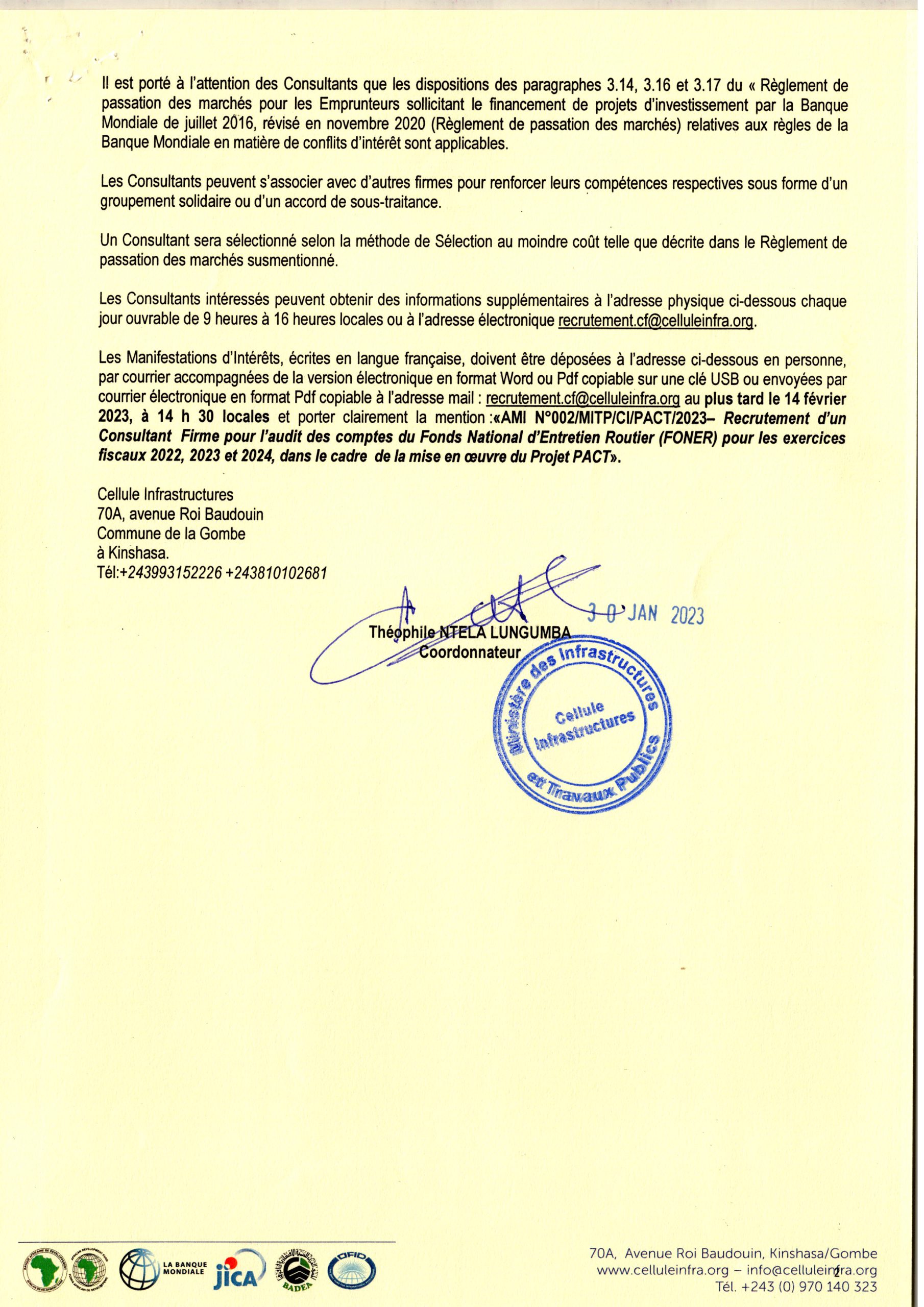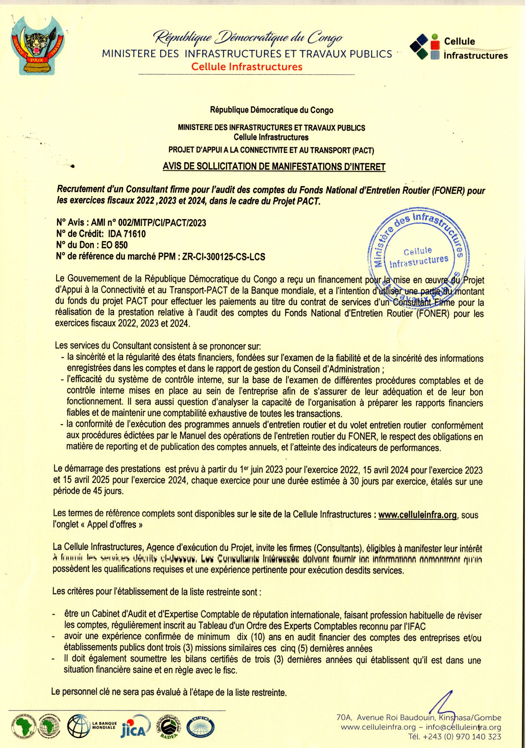 Recrutement d’un Consultant firme pour l’audit des comptes du Fonds National d’Entretien Routier (FONER) pour exercices fiscaux 2022,2023 et 2024, dans le cadre du projet PACT.