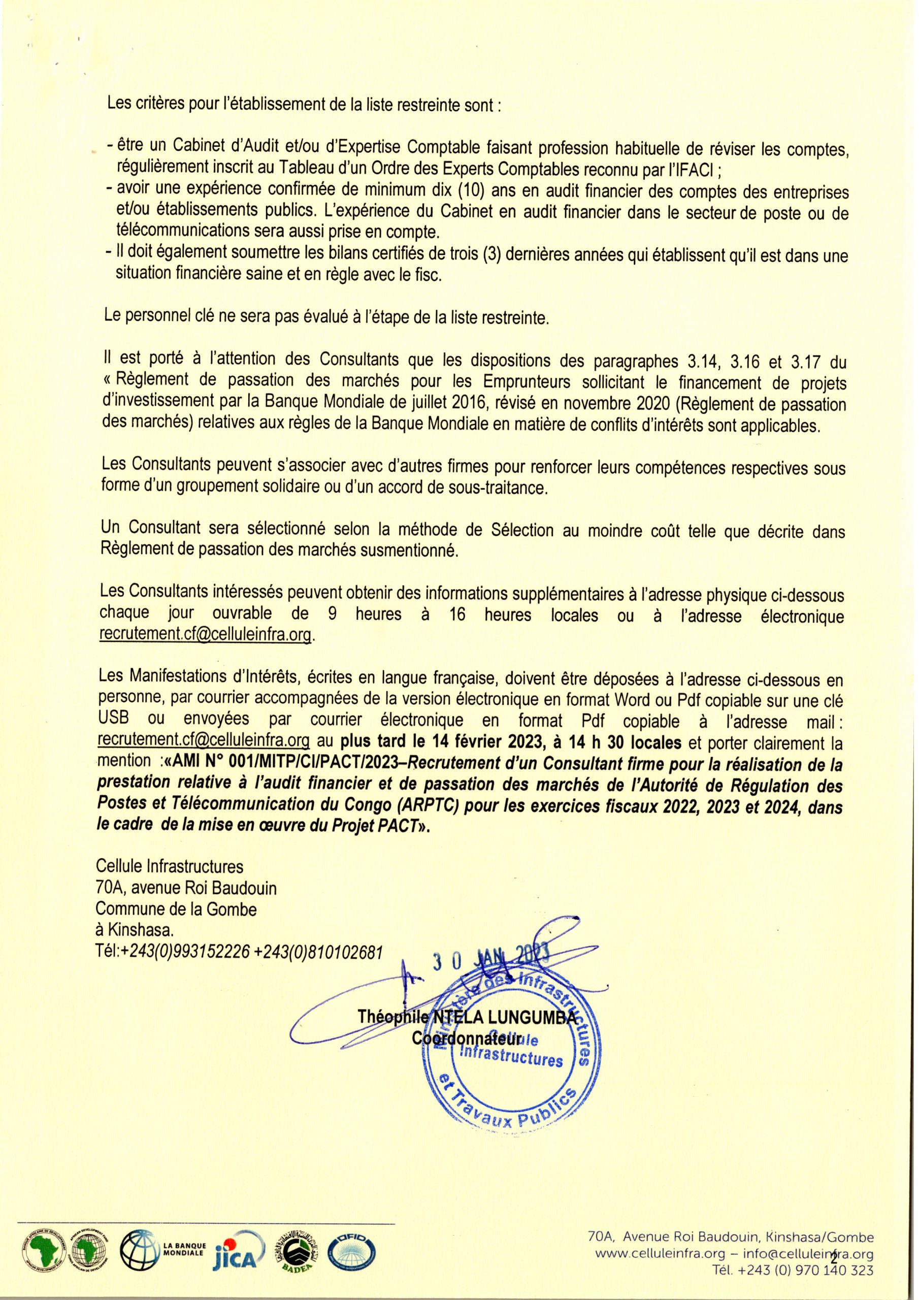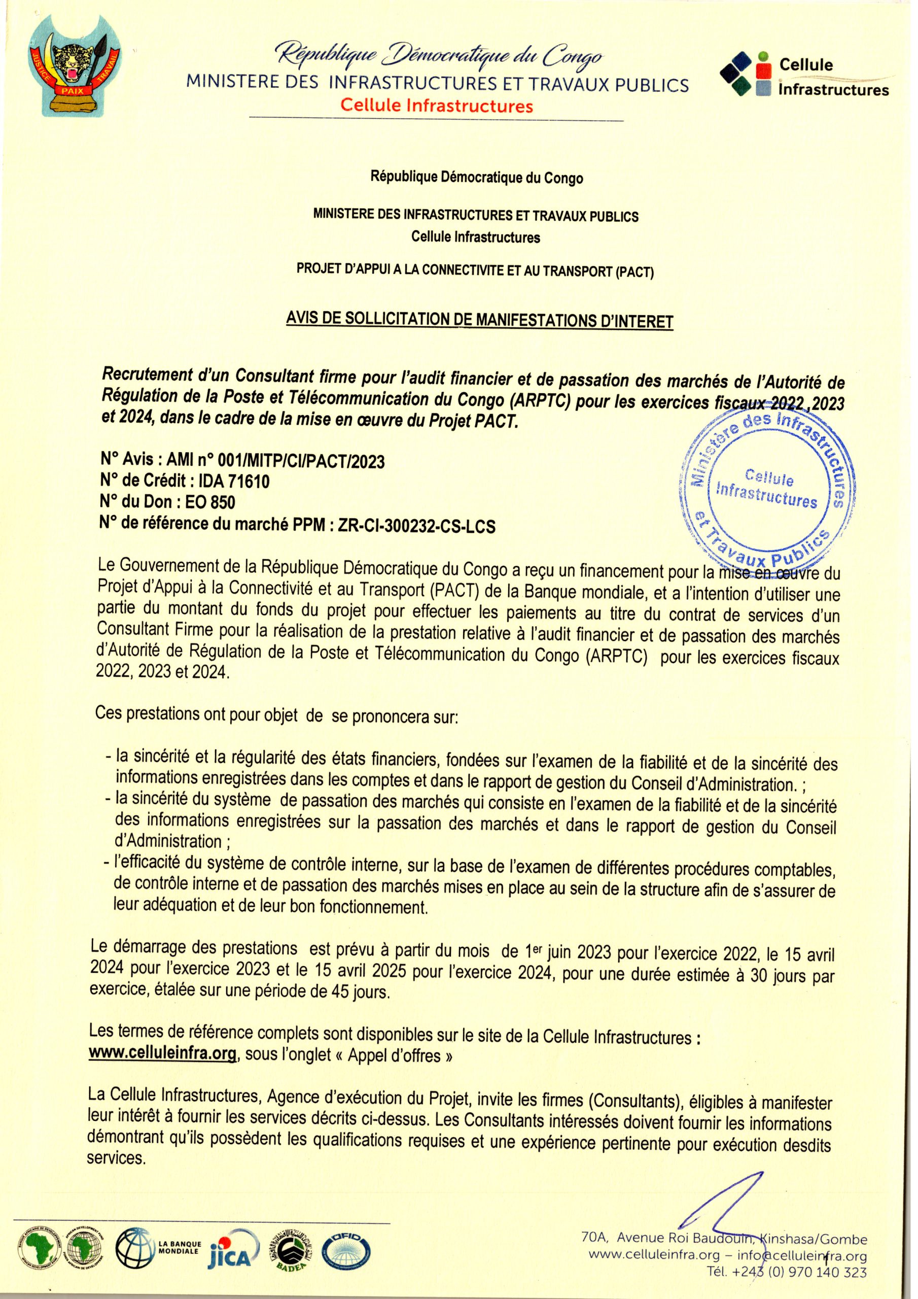 Recrutement d’un Consultant firme pour l’audit financier et de passation des marchés de l’Autorité de Régulation de la Poste et Télécommunication du Congo (ARPTC) pour les exercices fiscaux 2022, 2023 et 2024, dans le cadre de la mise en œuvre du Projet PACT.
