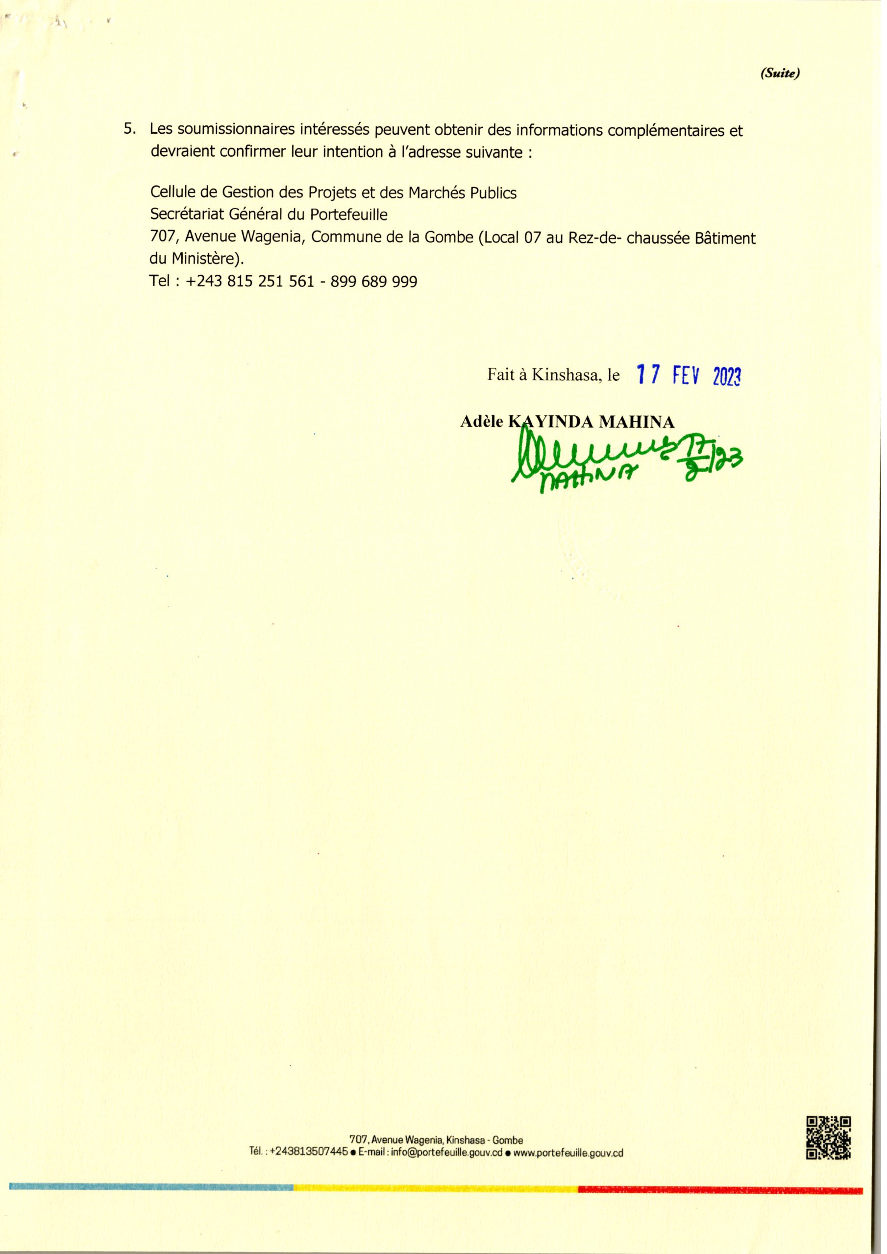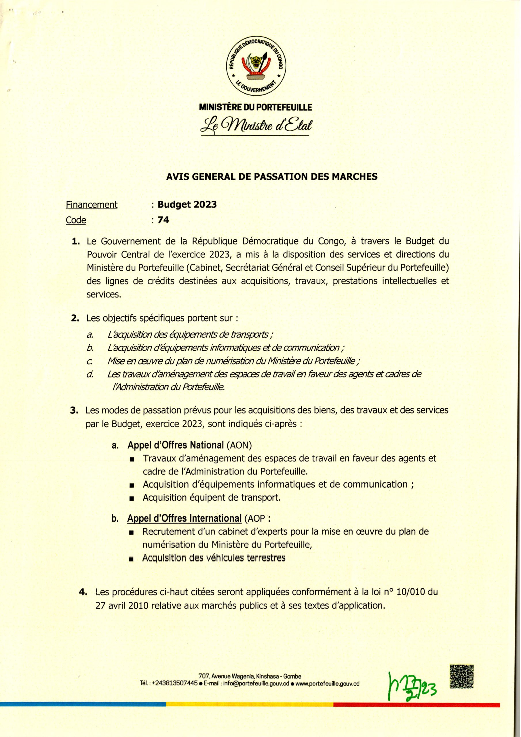 Avis général de passation des marches d’un appel d’offres international relatif au recrutement d’un cabinet d’experts pour la mise en œuvre du plan de numérisation du ministère du portefeuille.
