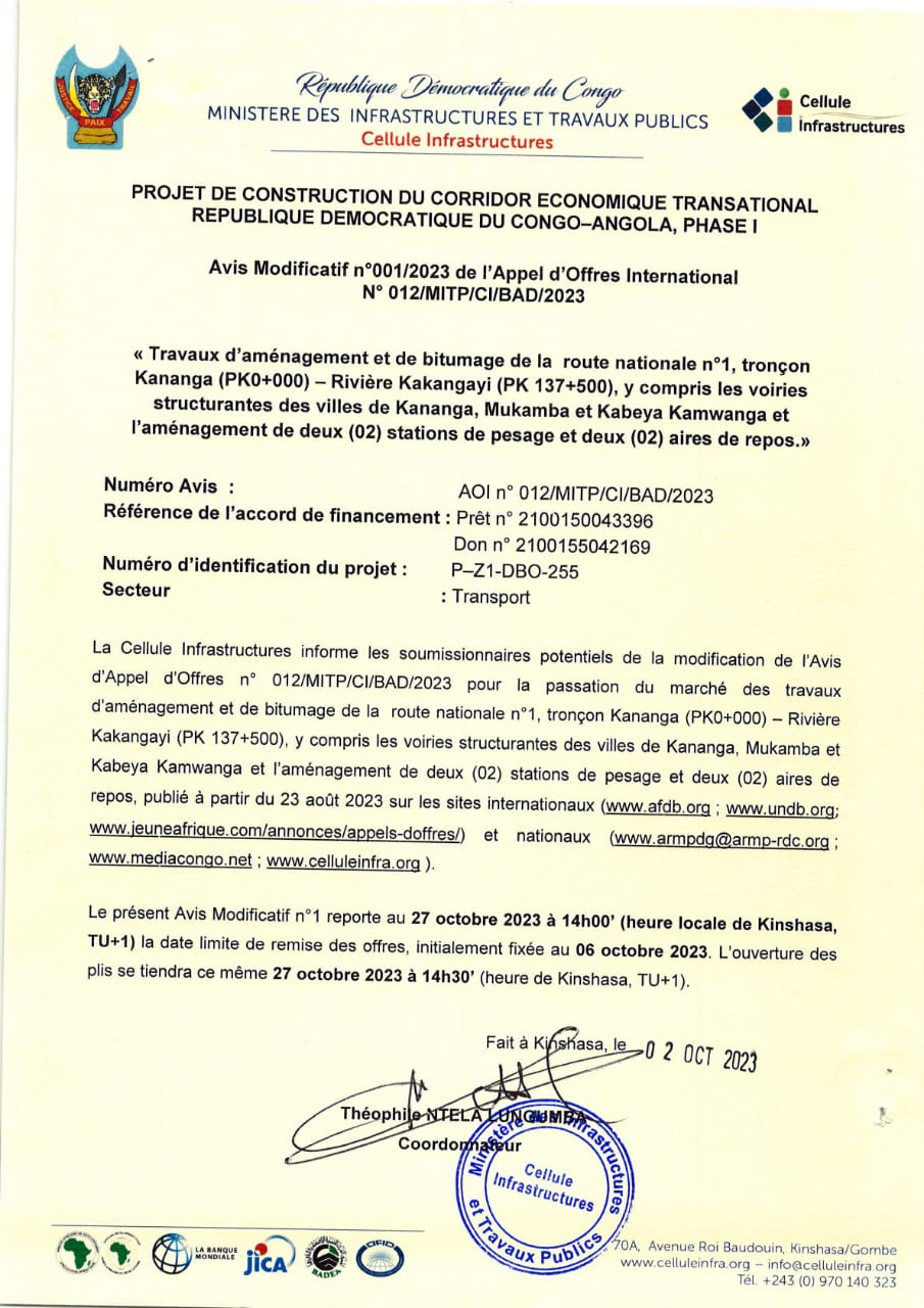 Avis Modificatif de l’appel d’Offres International de MITP relatif aux travaux d’aménagement et de bitumage de la route nationale n°1, tronçon Kananga (PK0+000) – Rivière Kakangayi (PK 137+500), y compris les voiries structurantes des villes de Kananga,….