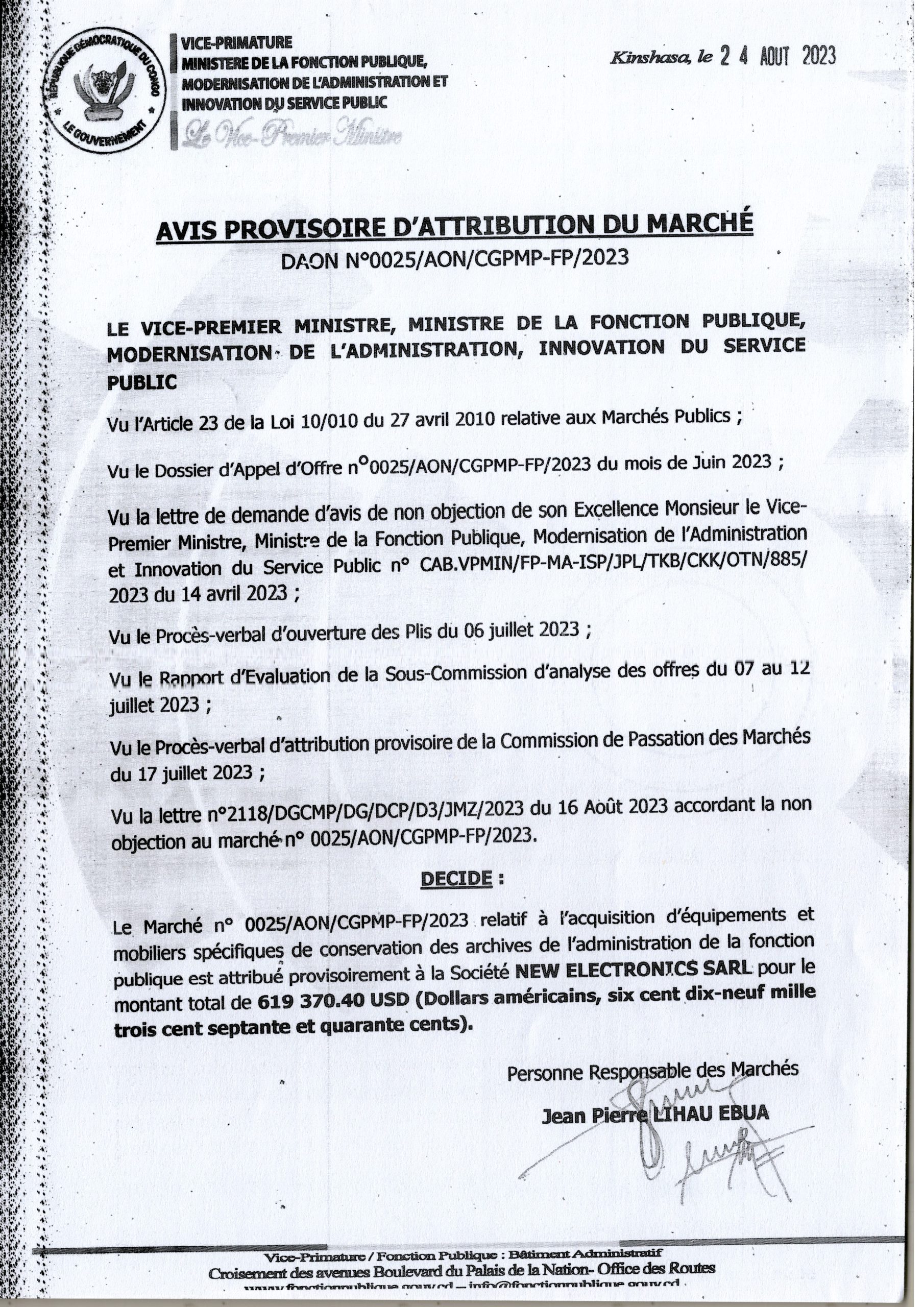 AVIS PROVISOIRE D’ATTRIBUTION DU MARCHÉ ACCORDÉE À LA SOCIÉTÉ NEW ELECTRONICS SARL RELATIVE À L’ACQUISITION D’ÉQUIPEMENTS ET MOBILIERS SPÉCIFIQUES DE CONSERVATION DES ARCHIVES DE L’ADMINISTRATION DE LA FONCTION PUBLIQUE.