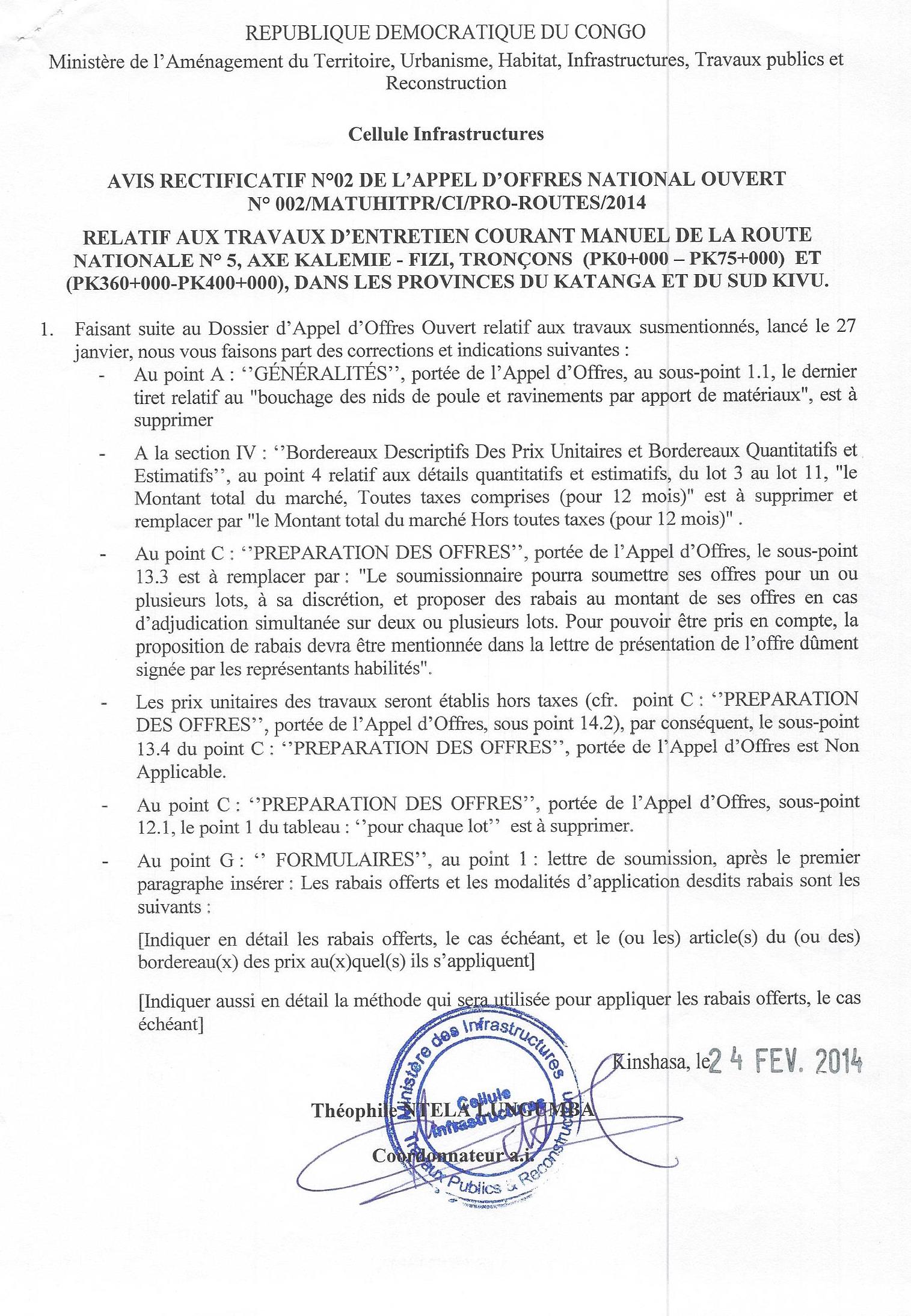 Avis rectificatif n°02 du marché relatif aux travaux d’entretien courant manuel de la route nationale n°5, axe Kalemie-Fizi, tronçons (PK0 + 000-PK75+000) et (PK360+000-PK400+000), dans les provinces du Katanga et du Sud Kivu.