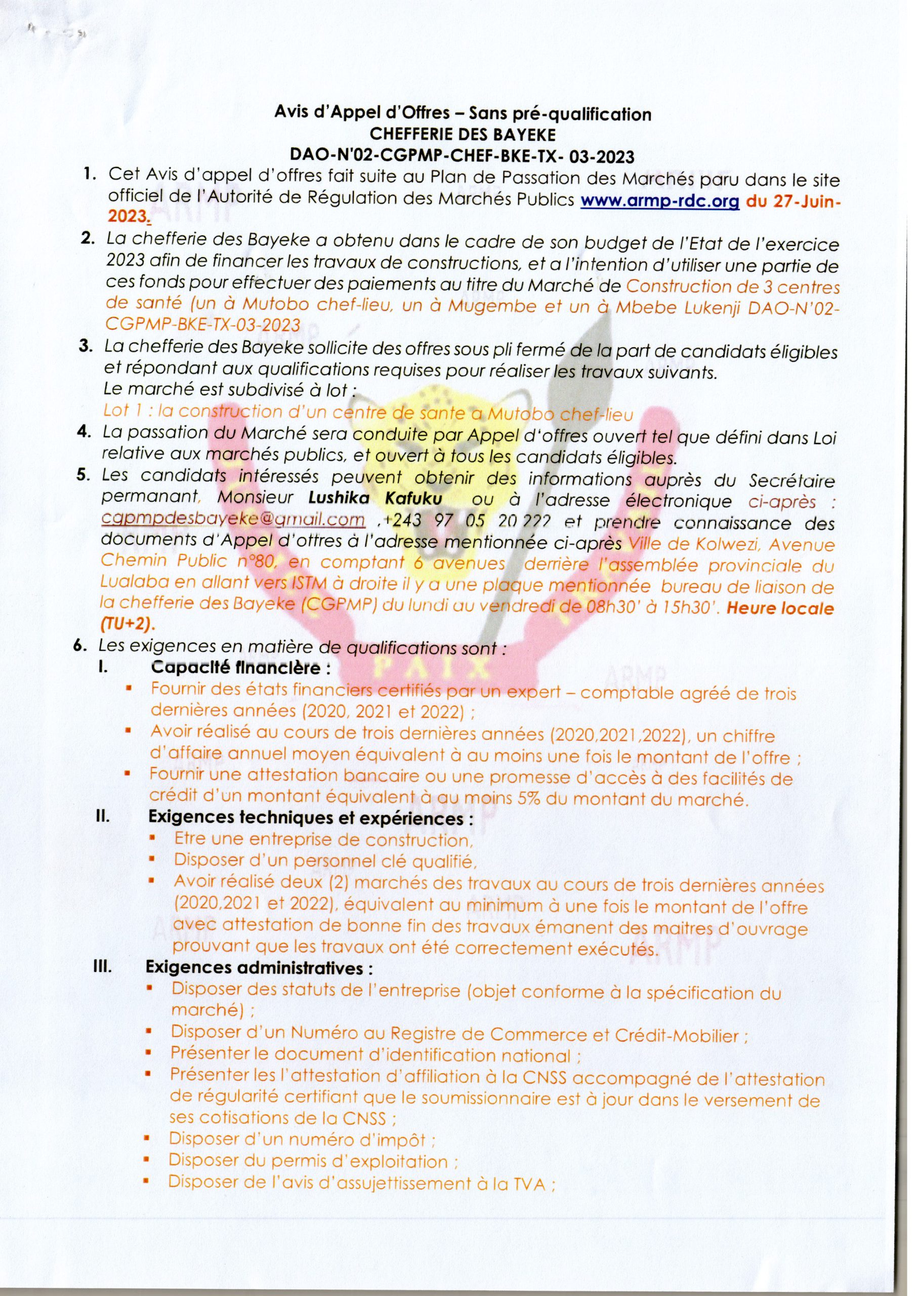 Construction de 3 Centres de Santé (un à Mutobo chef-lieu, un à Mugembe et un à mbebe lukenji (lot 1))