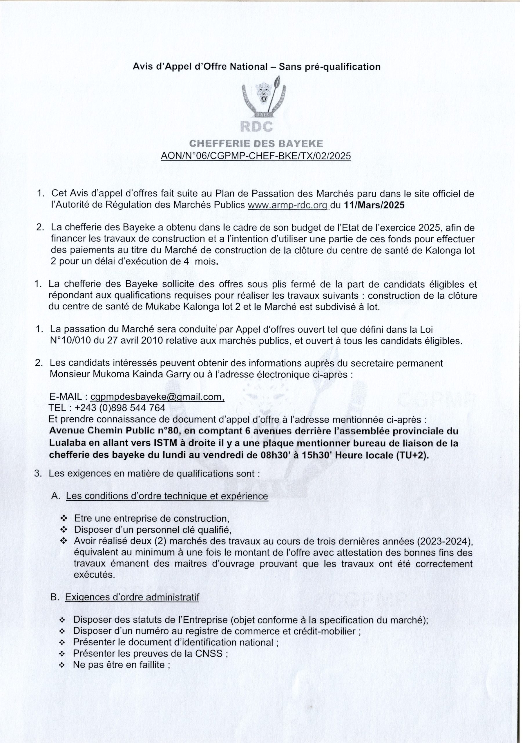 Construction de la clôture du centre de santé de Mukabe Kalonga lot 2.