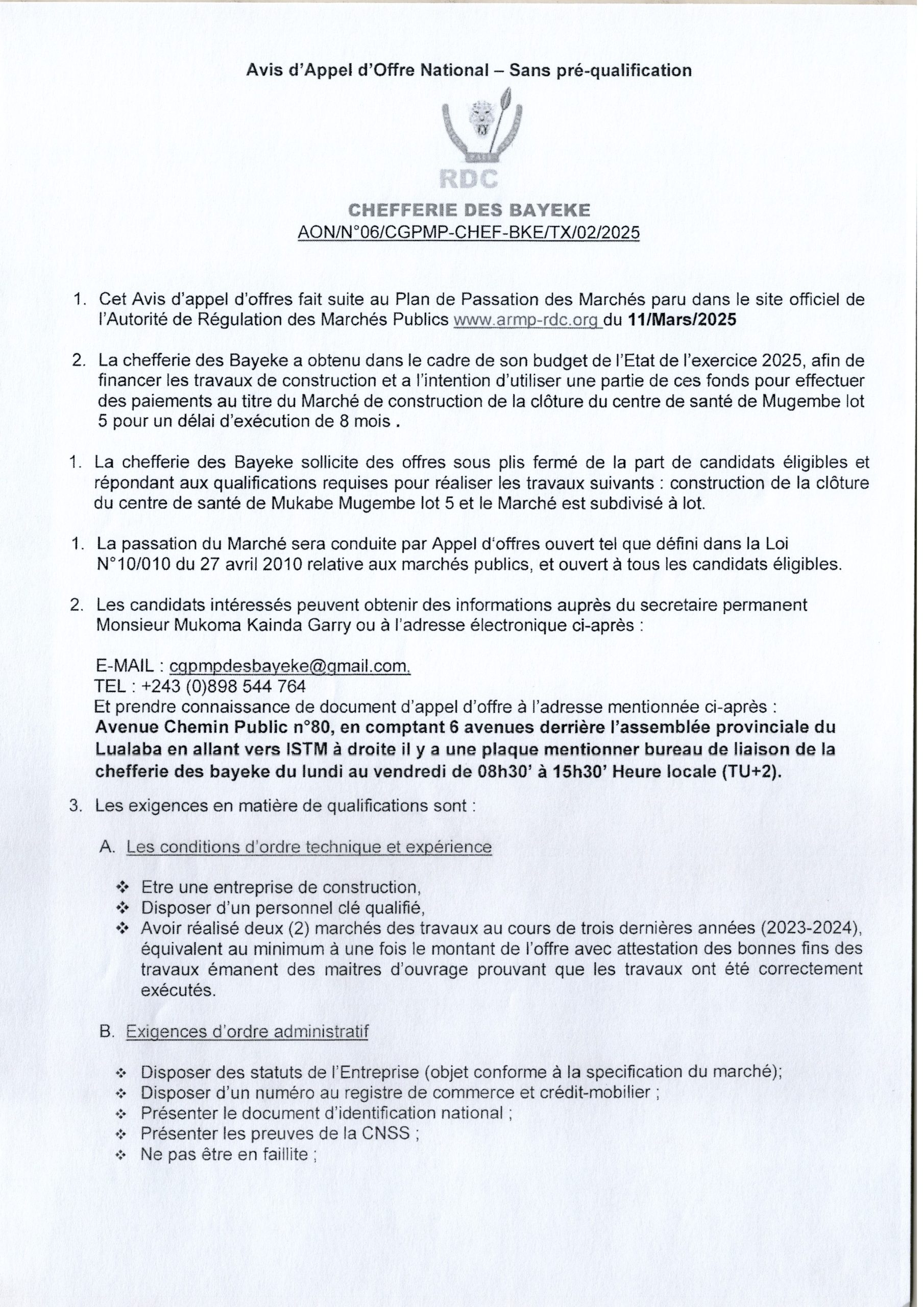 Construction de la clôture du centre de santé de Mukabe Mugembe lot 5.