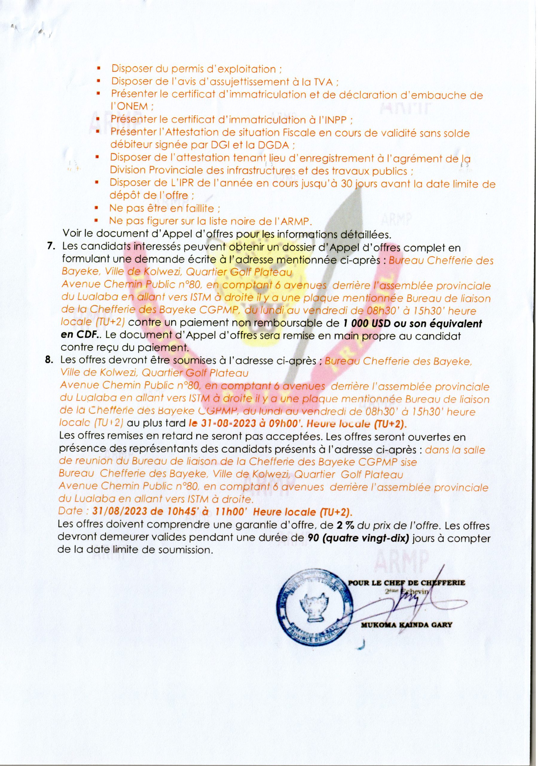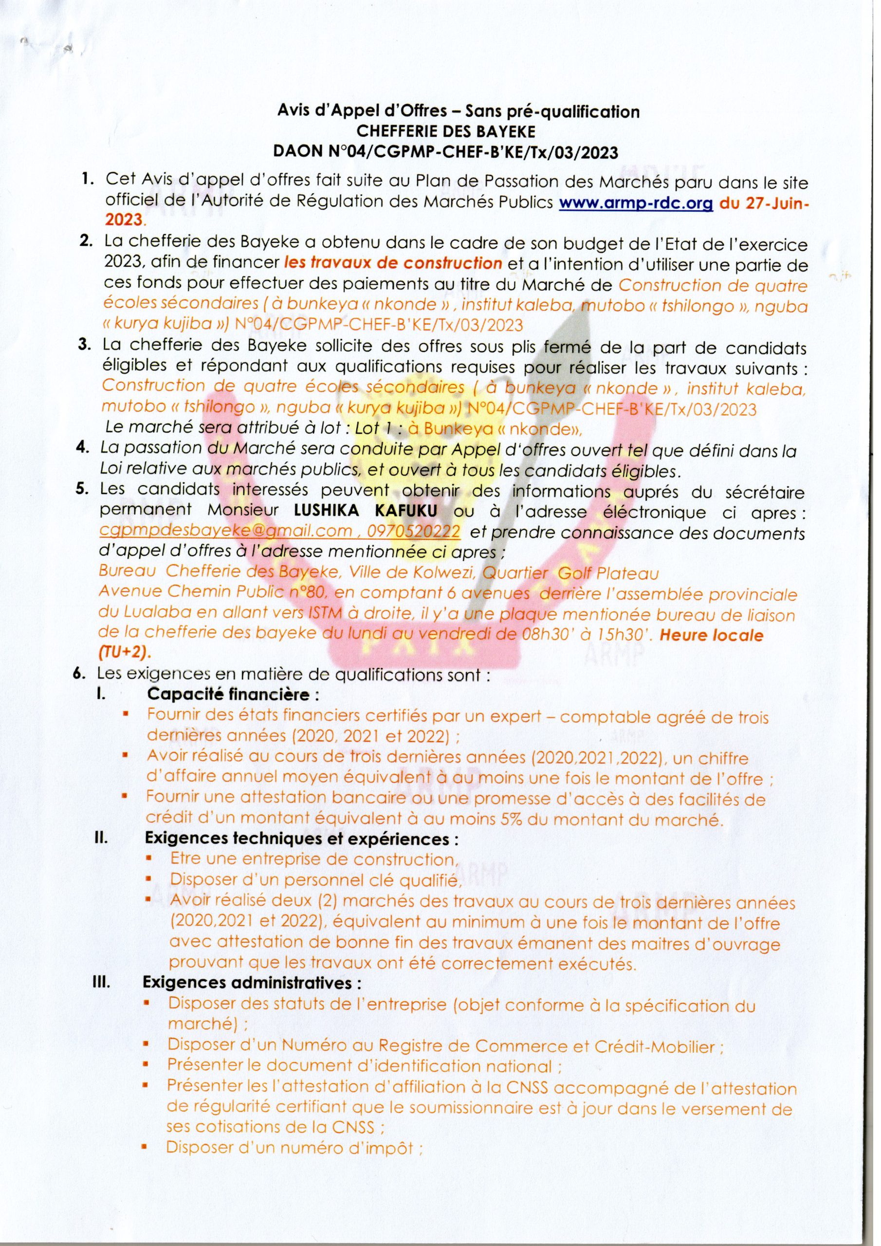 Construction de quatre écoles Construction de quatre écoles secondaires (lot 1: à Bunkeya “nkonde”)