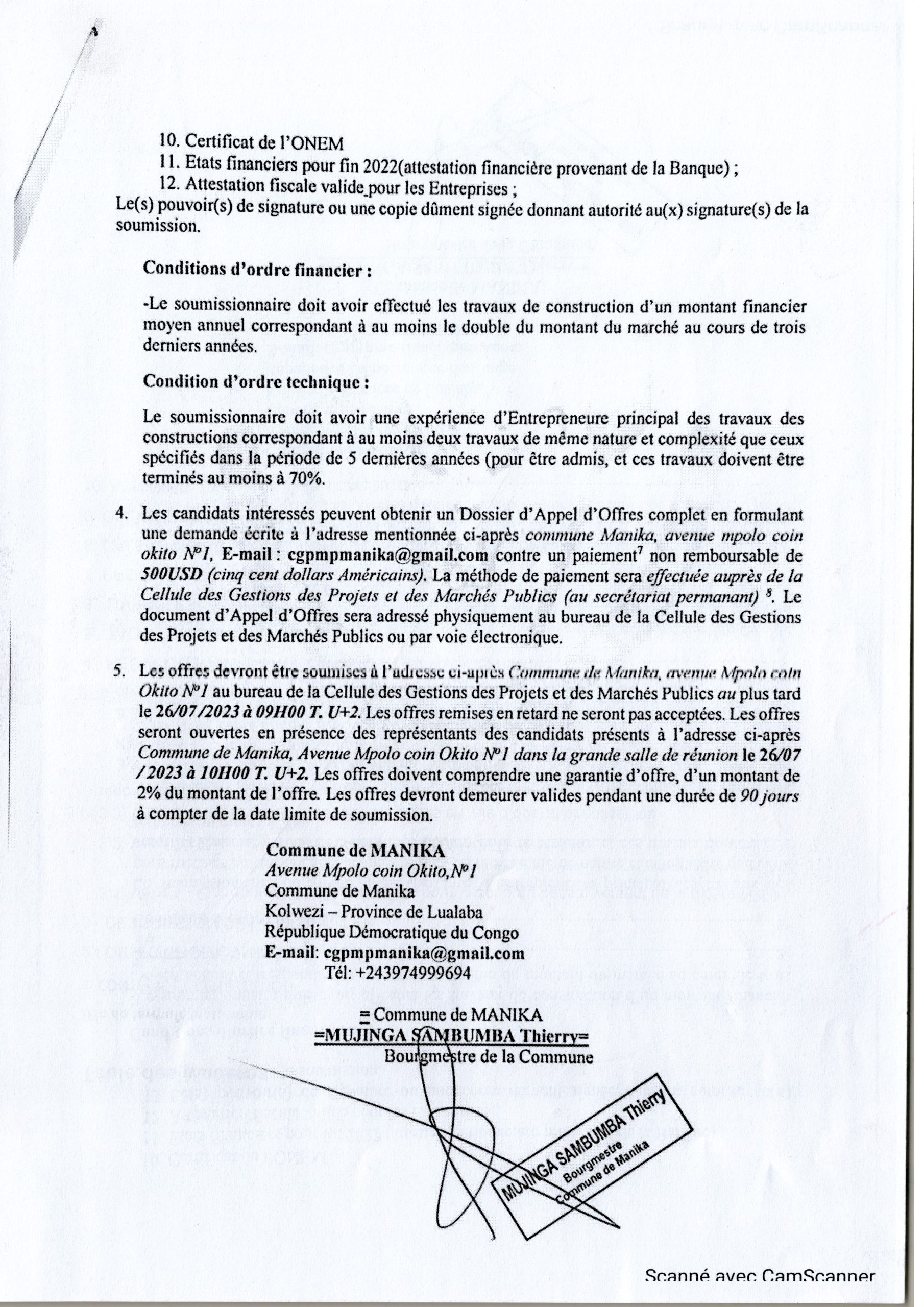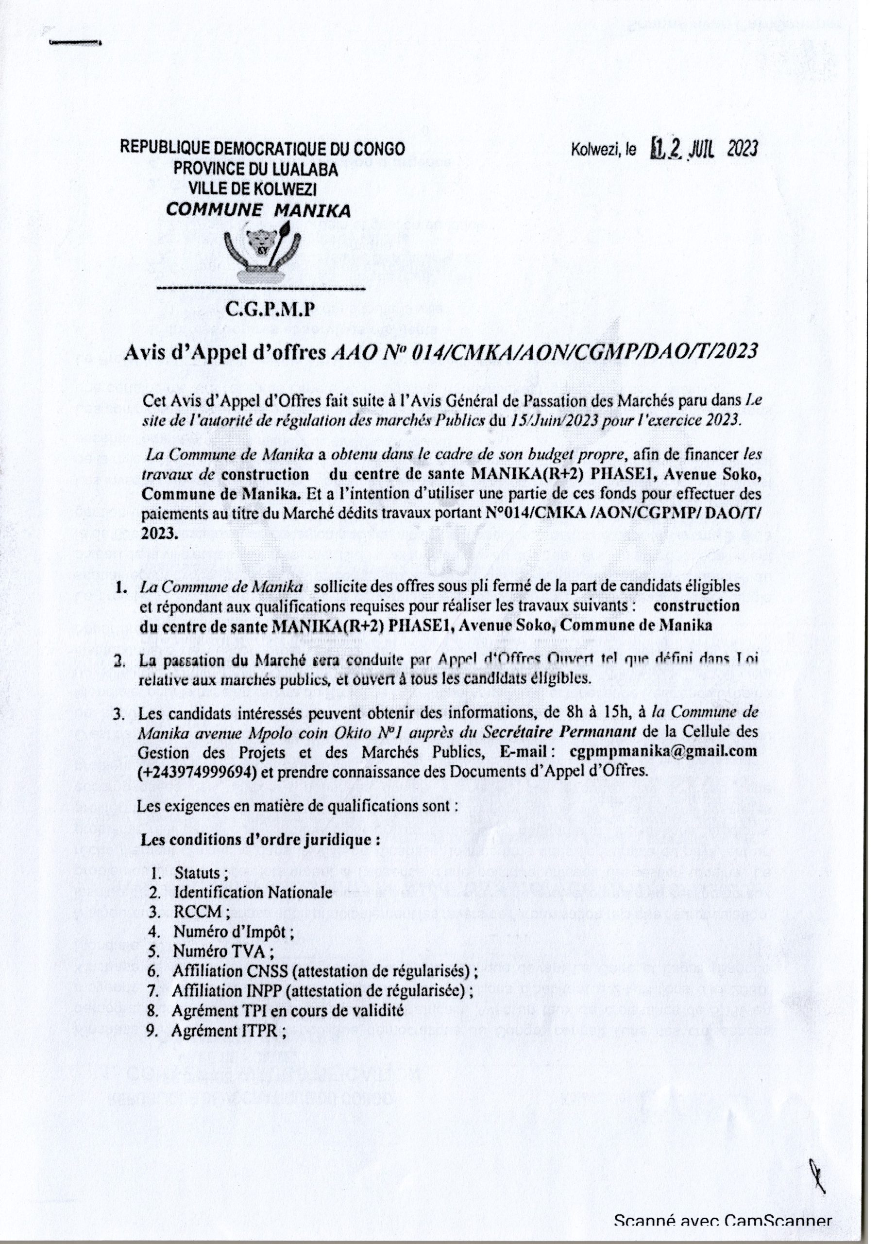 CONSTRUCTION DU CENTRE DE SANTE MANIKA(R+2)PHASE 1,AVENUE SOKO,COMMUNE DE MANIKA.