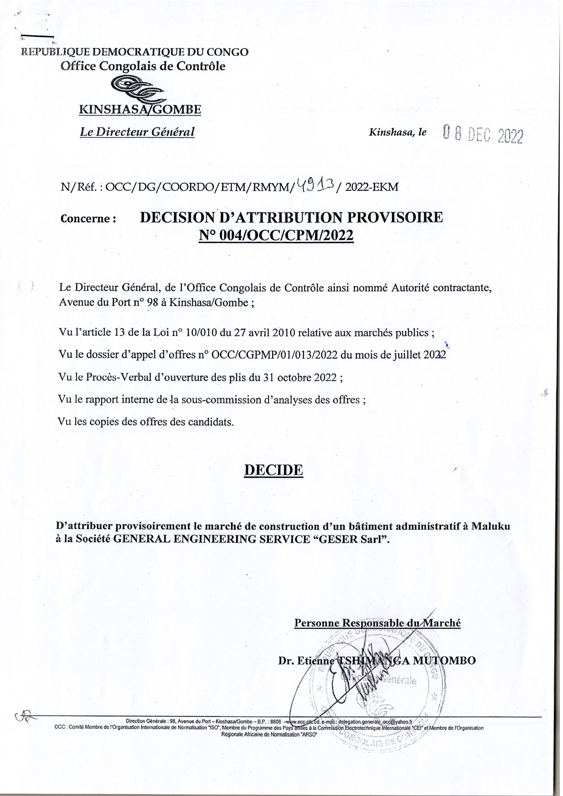 Construction d’un bâtiment administratif à Maluku marché accordé à la société GENERAL ENGINEERING SERVICE “GESER Sarl”
