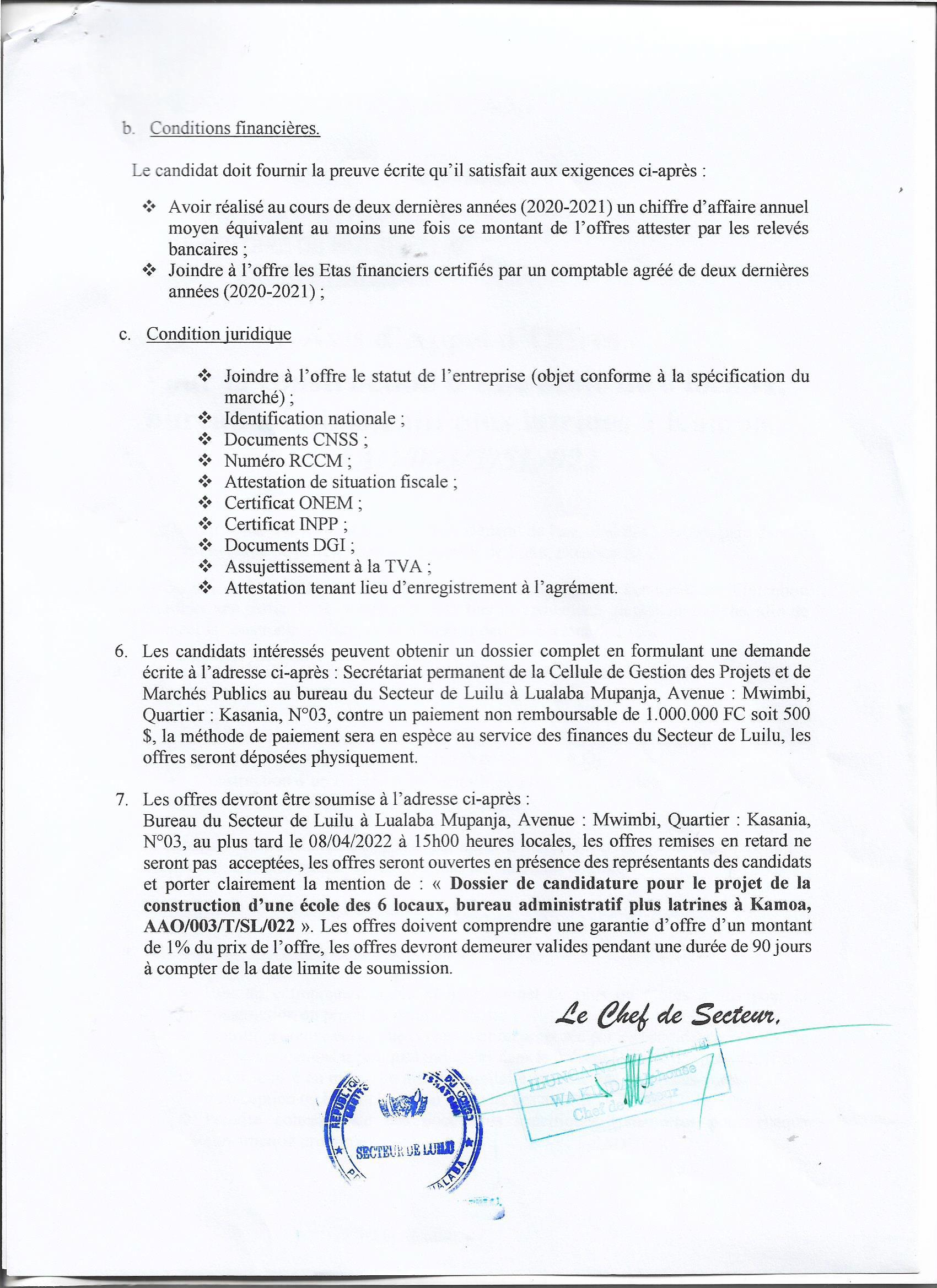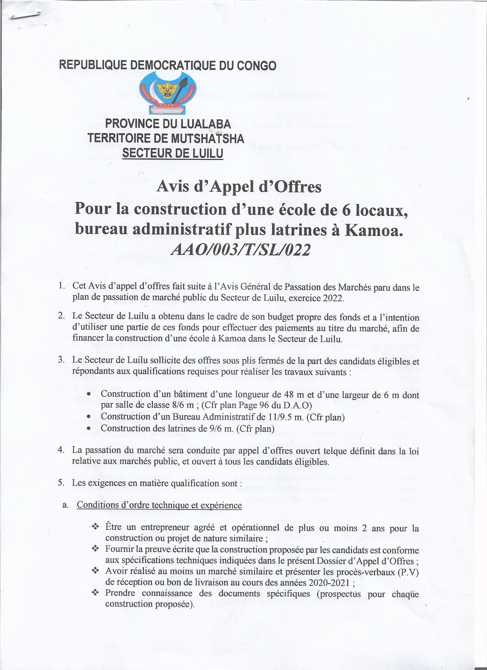 CONSTRUCTION D’UNE ÉCOLE DE 6 LOCAUX, BUREAU ADMINISTRATIF PLUS LATRINES À KAMOA
