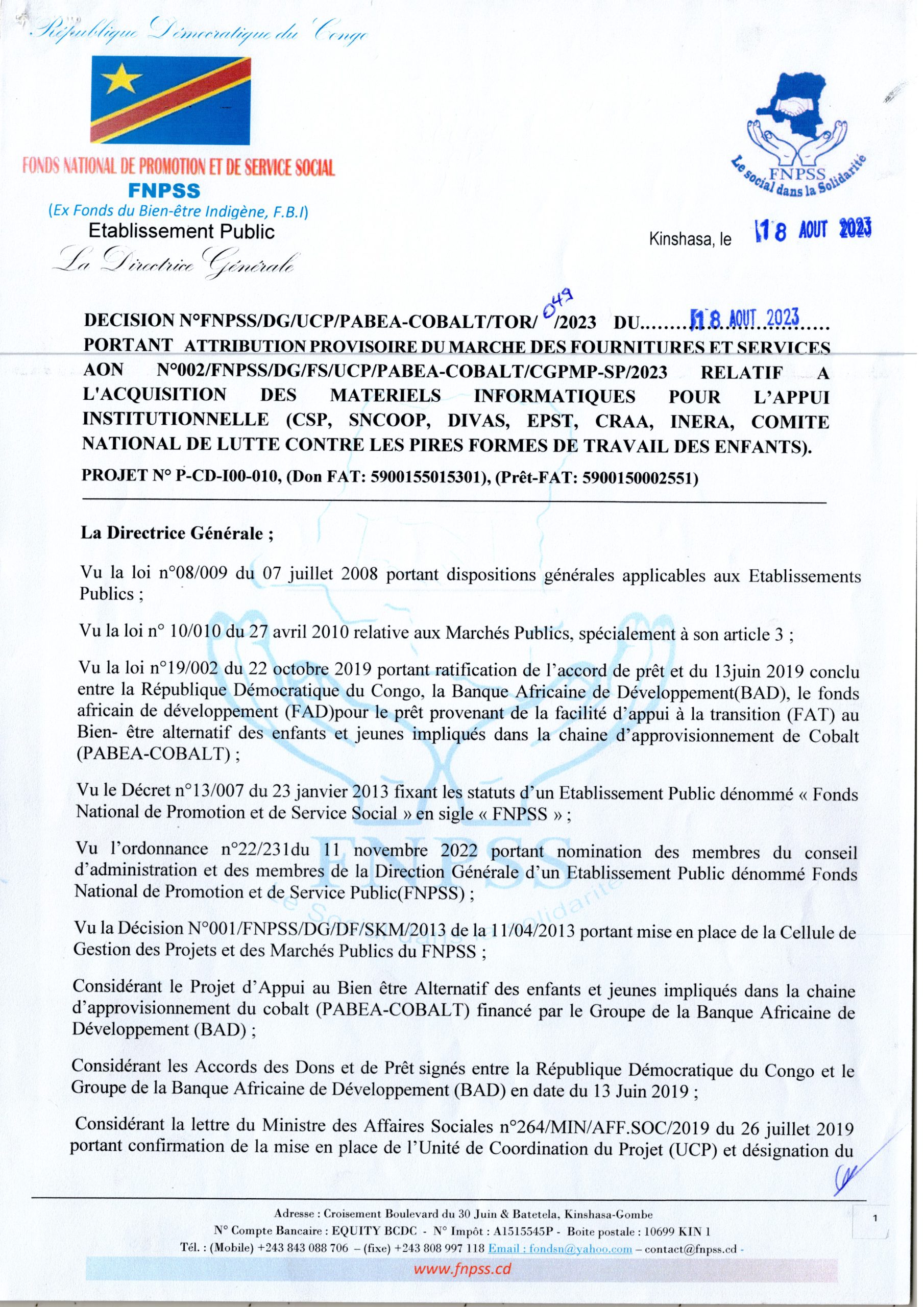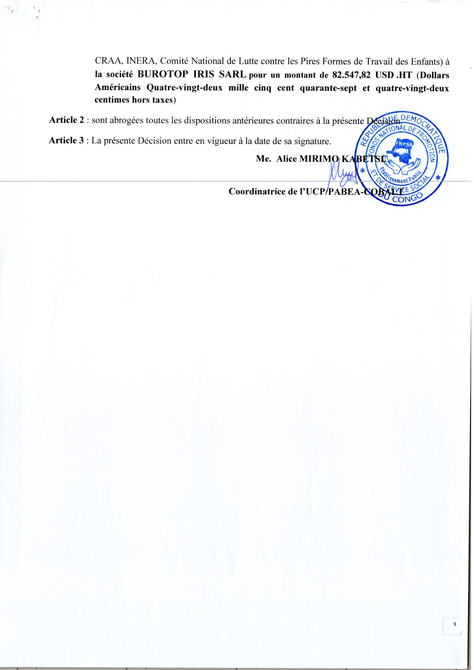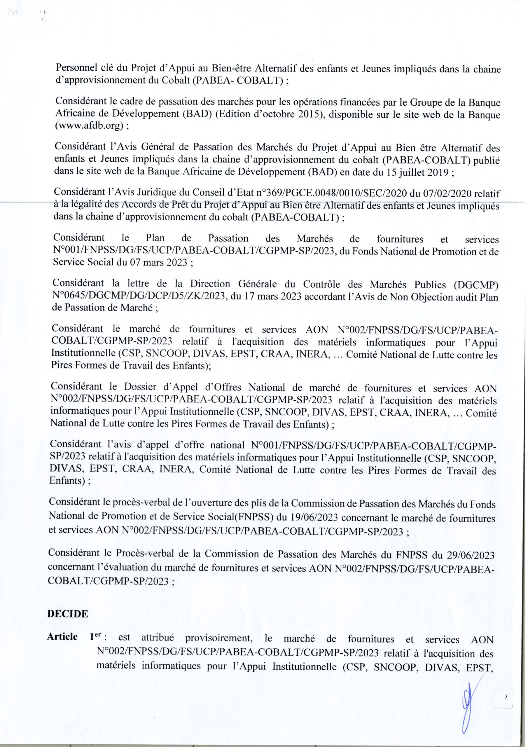 ATTRIBUTION PROVISOIRE DU MARCHÉ ACCORDÉE À LA SOCIÉTÉ BUROTOP IRIS SARL RELATIVE À L’ACQUISITION DES MATÉRIELS INFORMATIQUES POUR L’APPUI INSTITUTIONNELLE (CSP, SNCOOP, DIVAS, EPST, CRAA, INERA, COMITE NATIONAL…