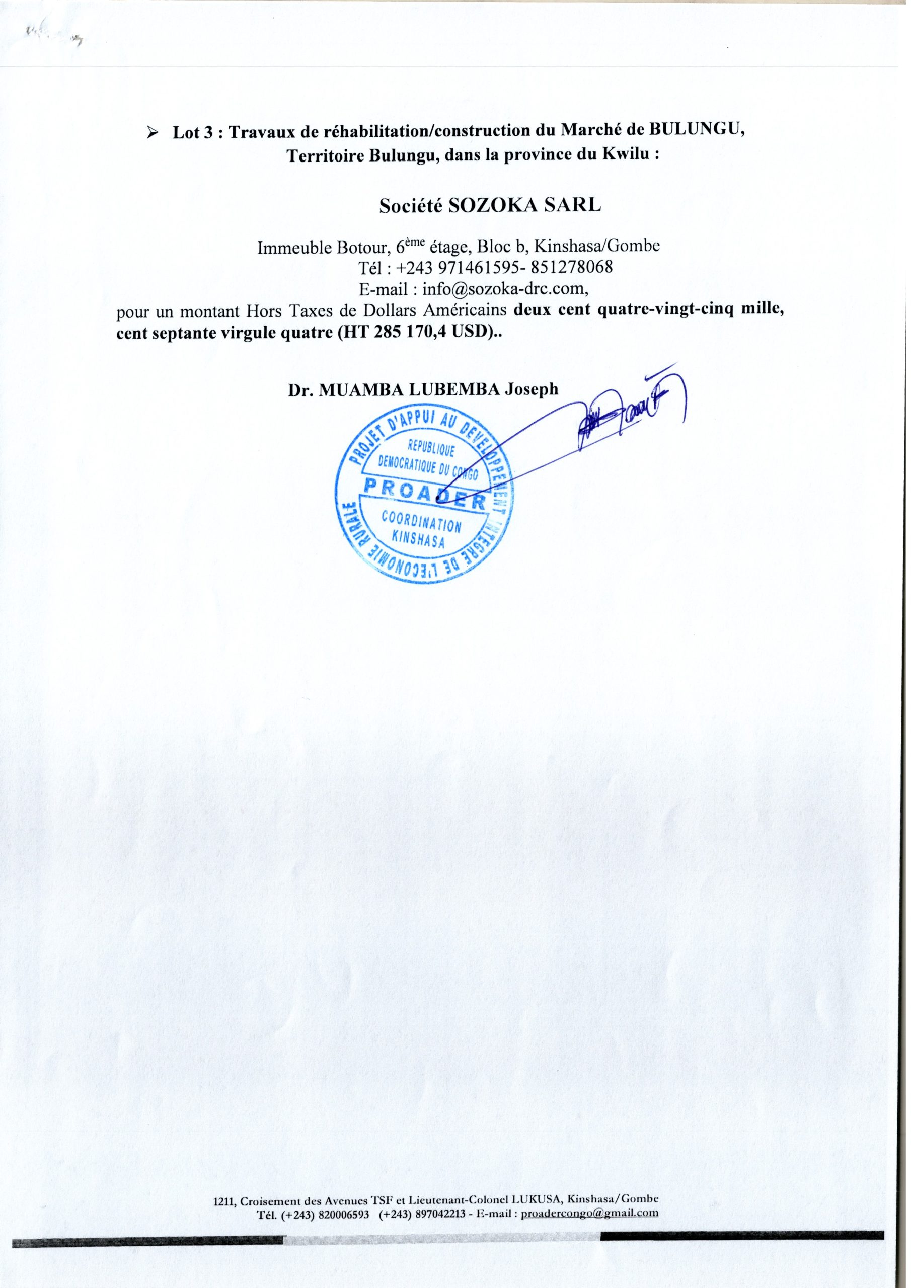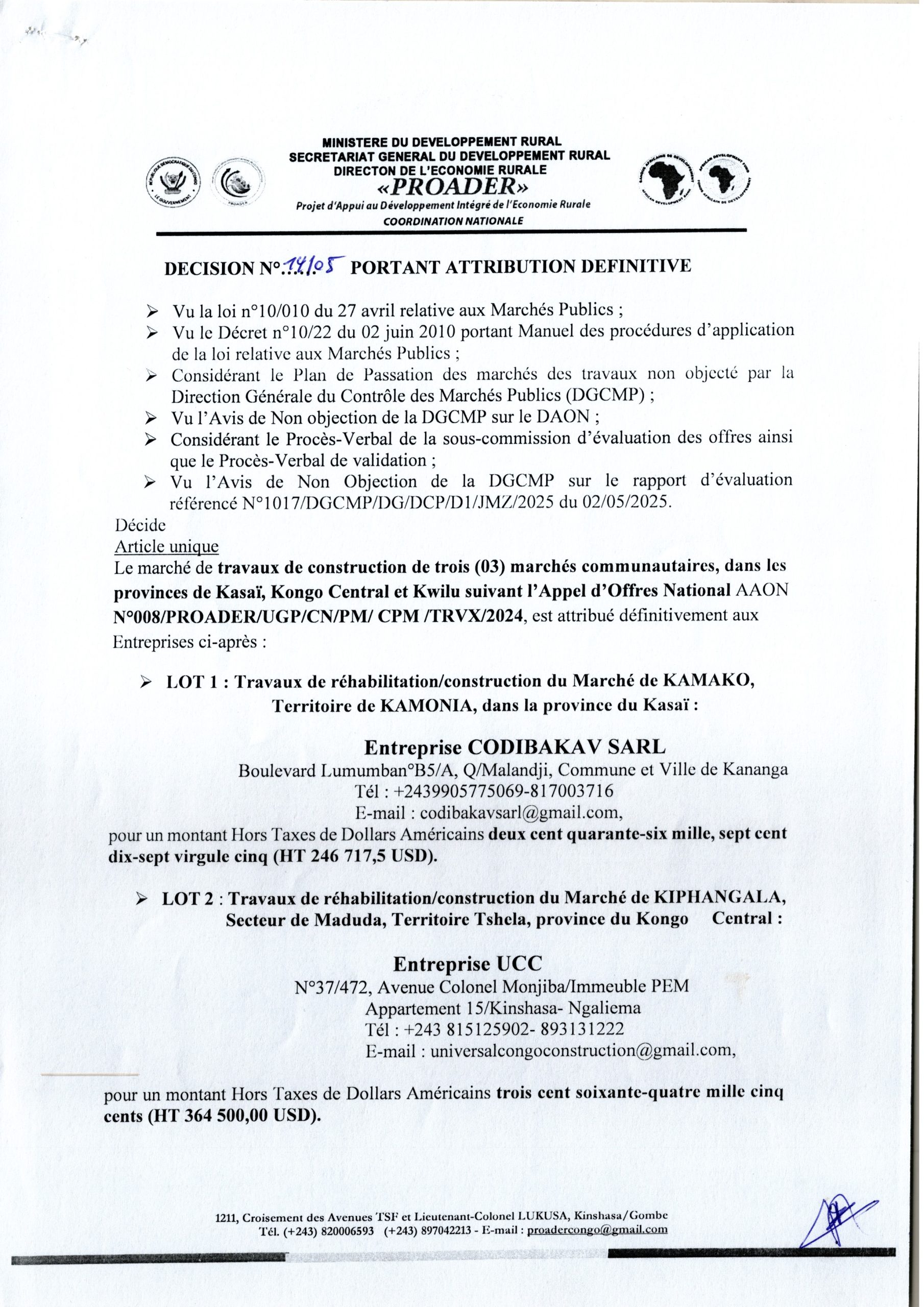 Décision d’attribution définitive accordée aux Entreprises CODIBAKAV SARL(lot 1), UCC (lot 2) et société SOZOKA SARL (lot 3) relative aux travaux de construction de trois (03) marchés communautaires, dans les provinces de Kasaï, Kongo Central et Kwilu.