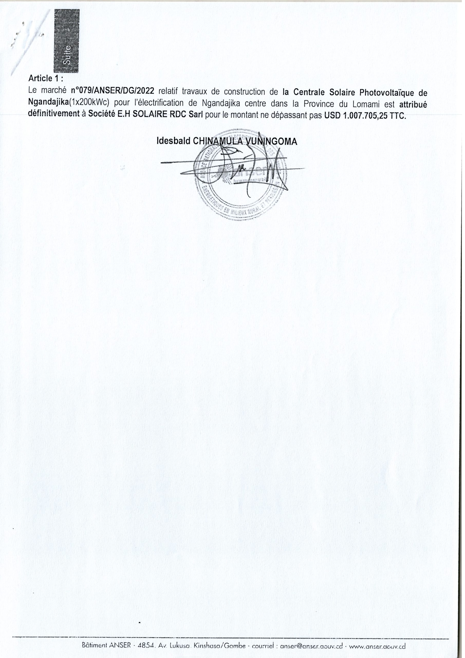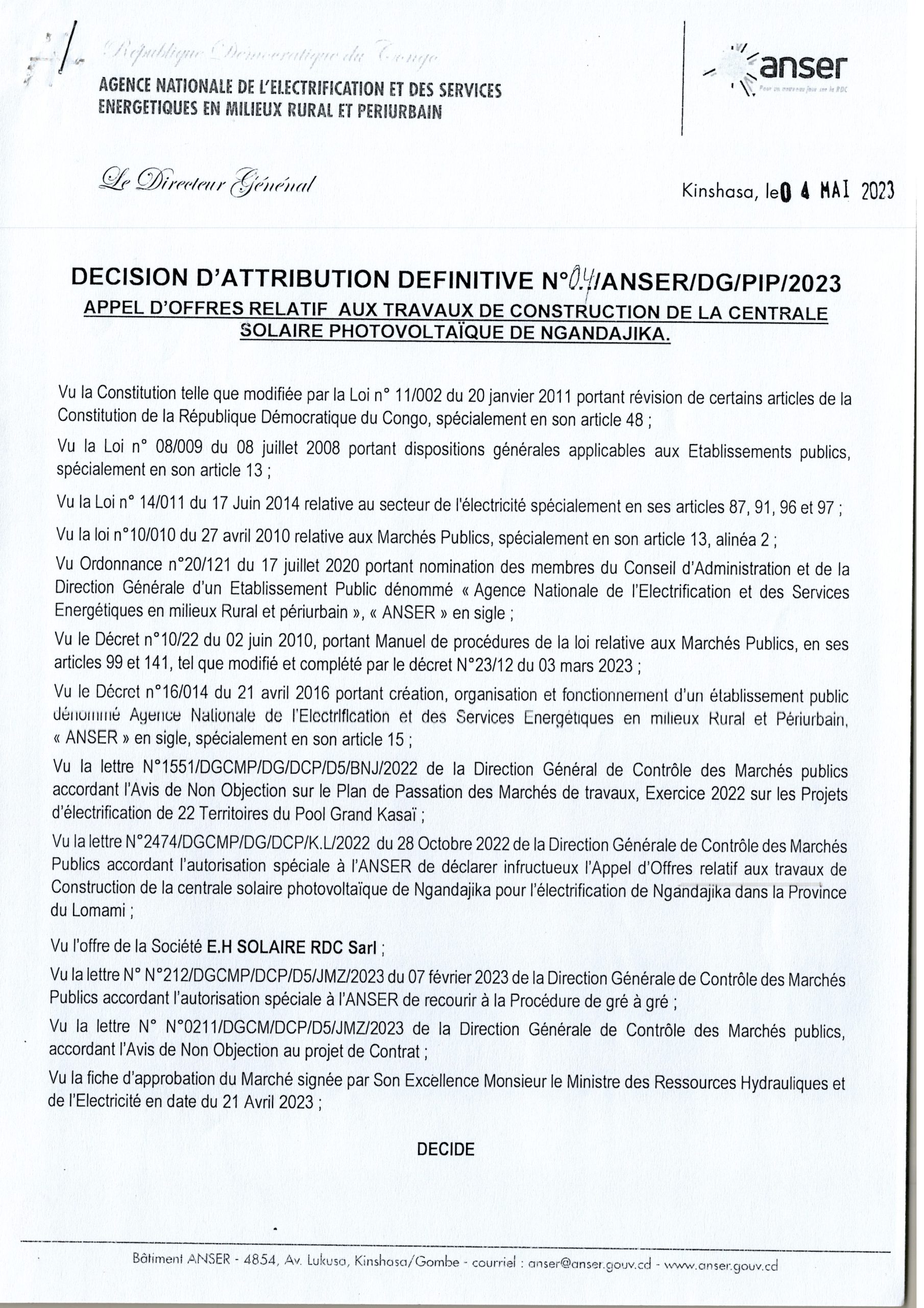 DÉCISION D’ATTRIBUTION DÉFINITIVE ACCORDÉE À LA SOCIÉTÉ E.H SOLAIRE RDC SARL RELATIVE AUX TRAVAUX DE CONSTRUCTION DE LA CENTRALE SOLAIRE PHOTOVOLTAÏQUE DE NGANDAJIKA.