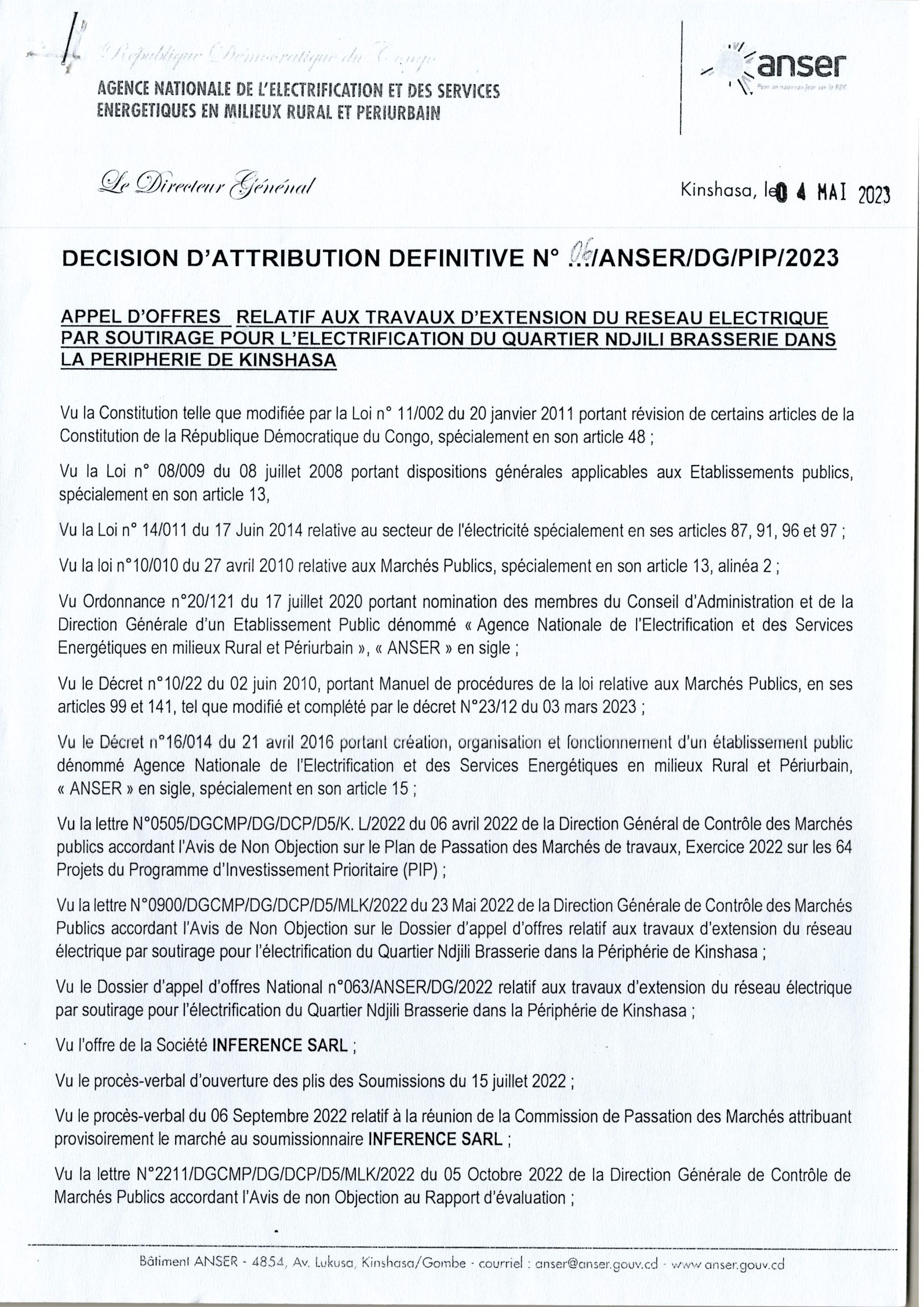 DÉCISION D’ATTRIBUTION DÉFINITIVE ACCORDÉE À LA SOCIÉTÉ INFERENCE SARL RELATIVE AUX TRAVAUX D’EXTENSION DU RÉSEAU ÉLECTRIQUE PAR SOUTIRAGE POUR L’ELECTRIFICATION DU QUARTIER NDJILI BRASSERIE DANS LA PÉRIPHÉRIE DE KINSHASA.