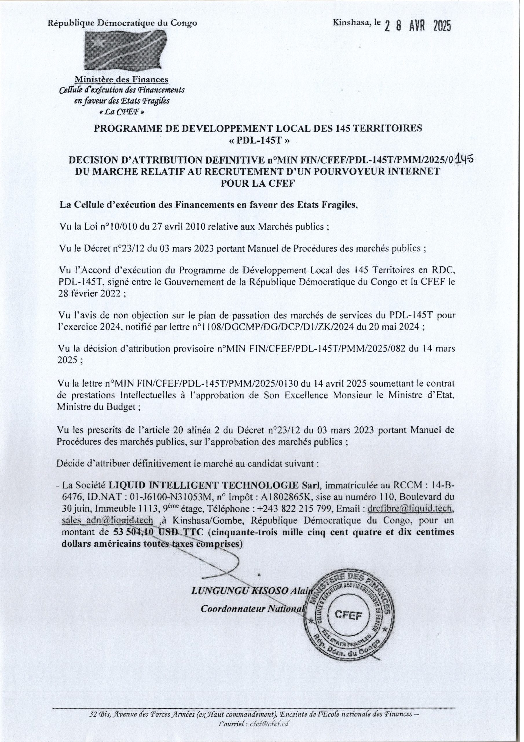 Attribution définitive accordée à la société LIQUID INTELLIGENT TECHNOLOGIE relative au recrutement d’un Pourvoyeur Internet pour la CFEF