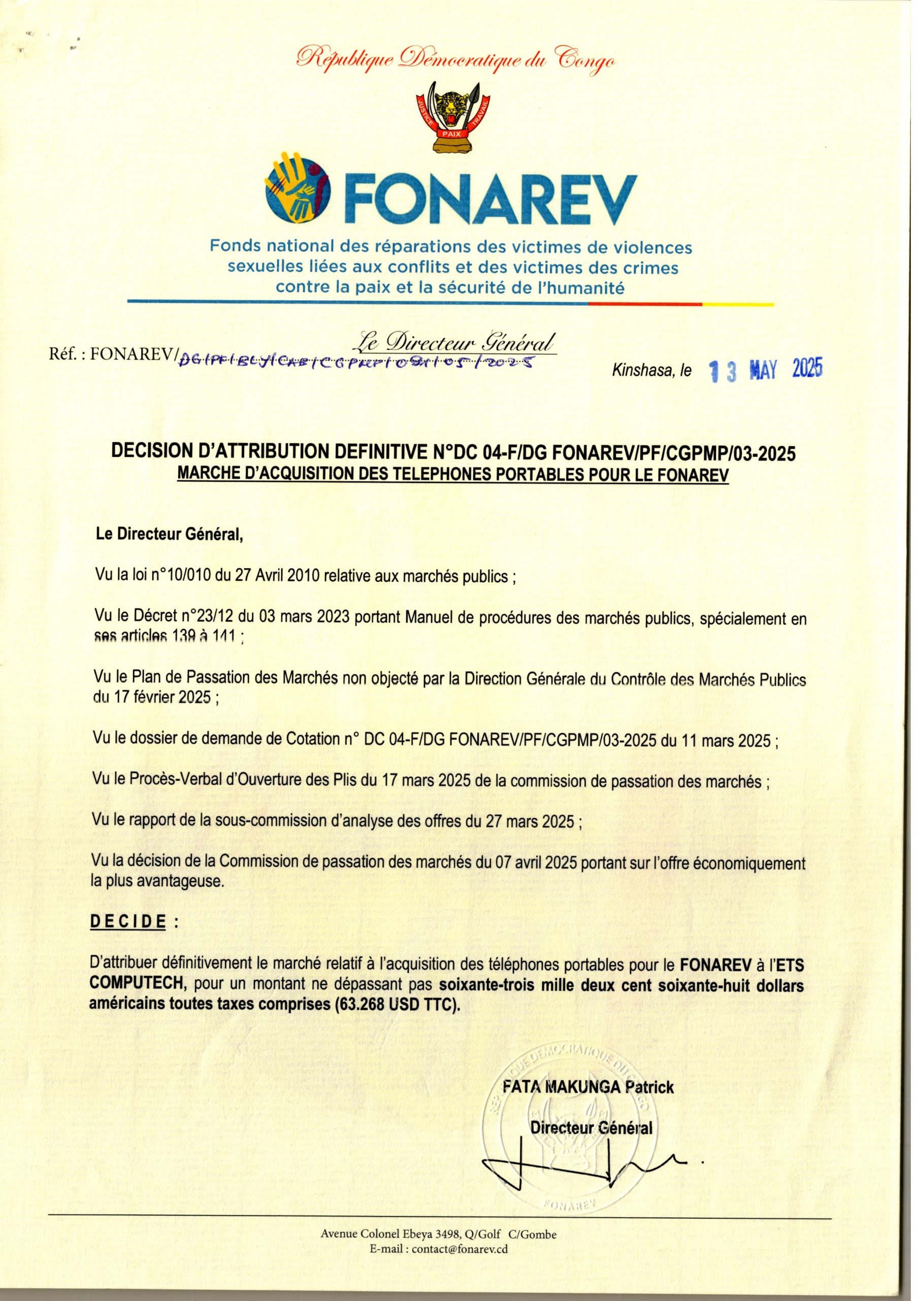 Attribution définitive accordée à l’ETS COMPUTECH marché relative à l’acquisition des téléphones portables pour le FONAREV.