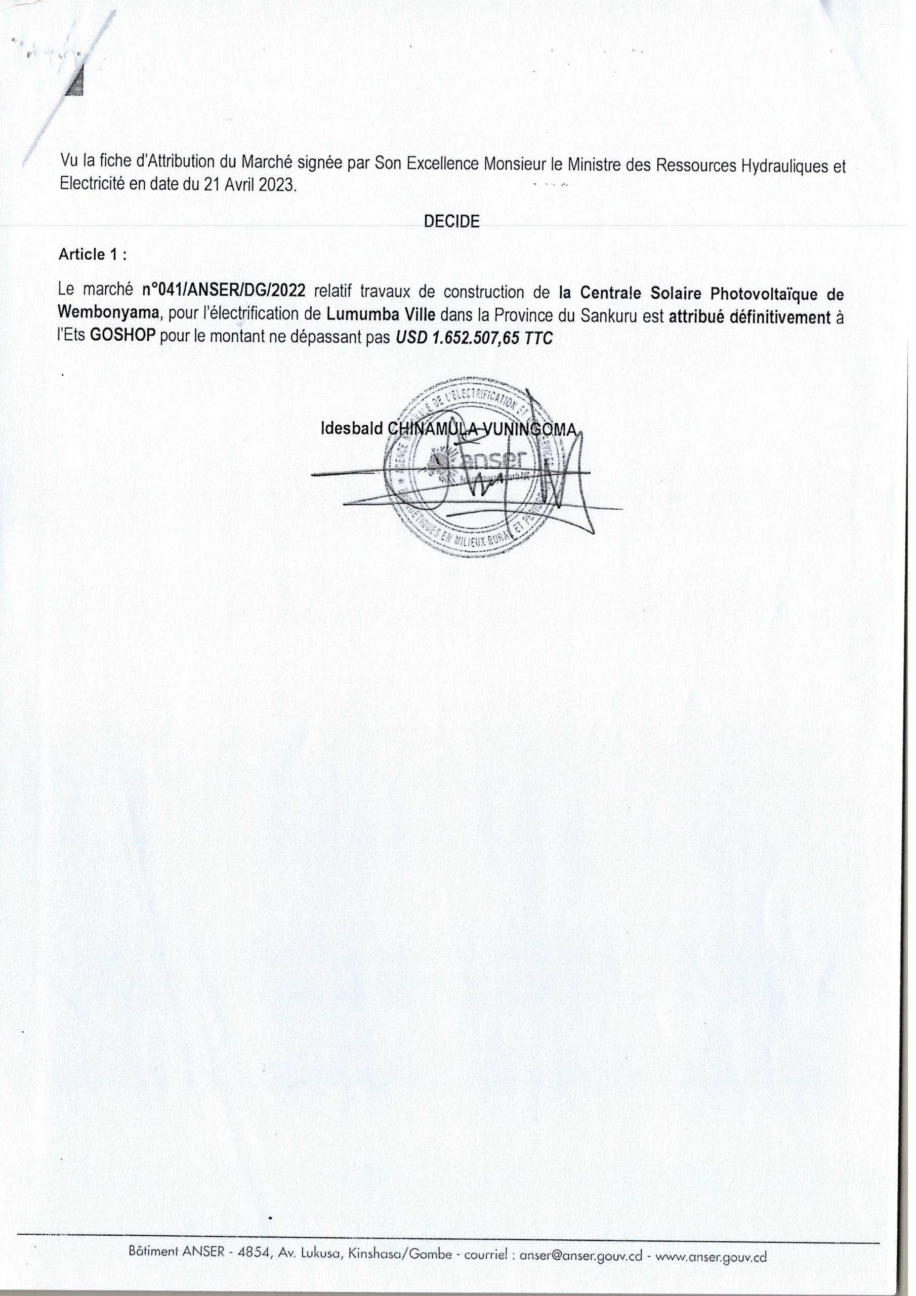 DÉCISION D’ATTRIBUTION DÉFINITIVE ACCORDÉE À L’ETS GOSHOP RELATIVE AUX TRAVAUX DE CONSTRUCTION DE LA CENTRALE SOLAIRE PHOTOVOLTAÏQUE DE WEMBONYAMA.
