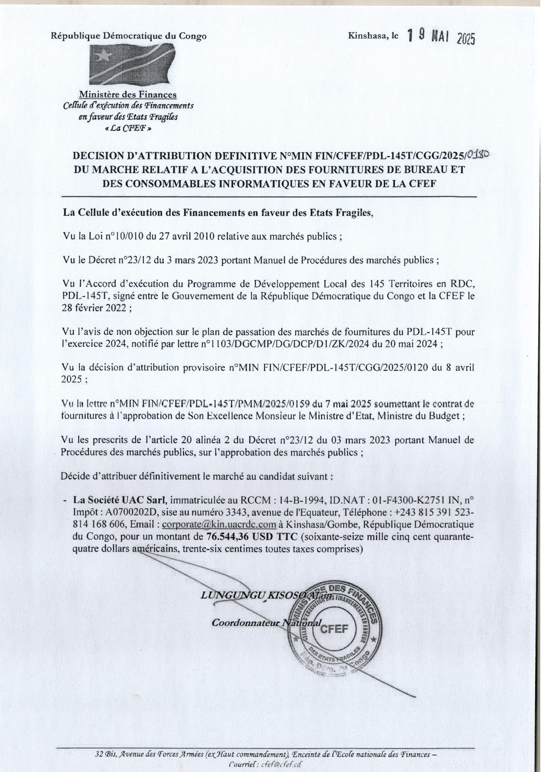 Décision d’attribution définitive de CFEF accordée à la société UAC relative à l’acquisition des fournitures de bureau et des consommables informatiques en faveur de la CFEF
