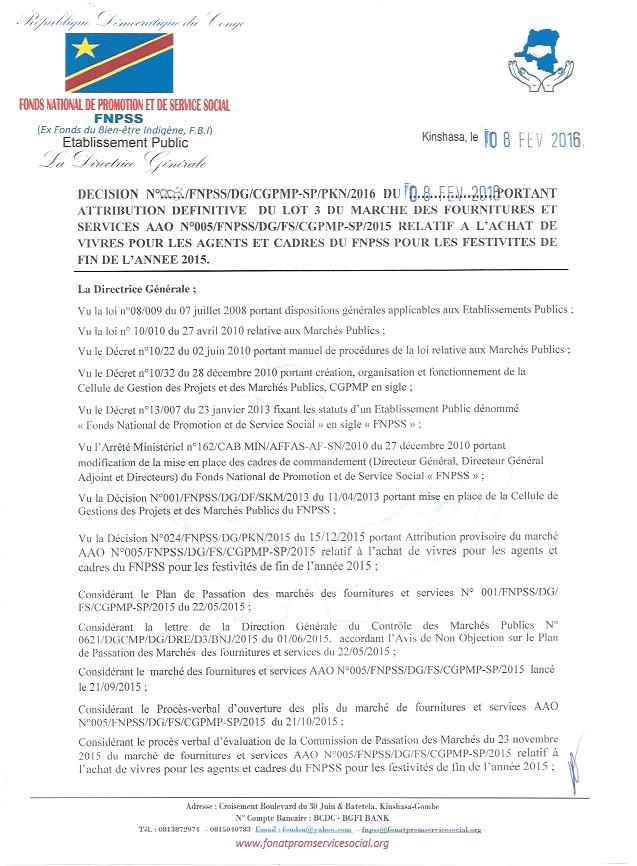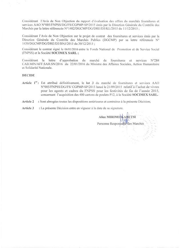 Décision d’attribution définitive en faveur de la société SOCIMEX Sarl relative au lot 3 du marché des fournitures et services dont AAO N°005/ENPSS/DG/FS/CGPMP-SP/2015