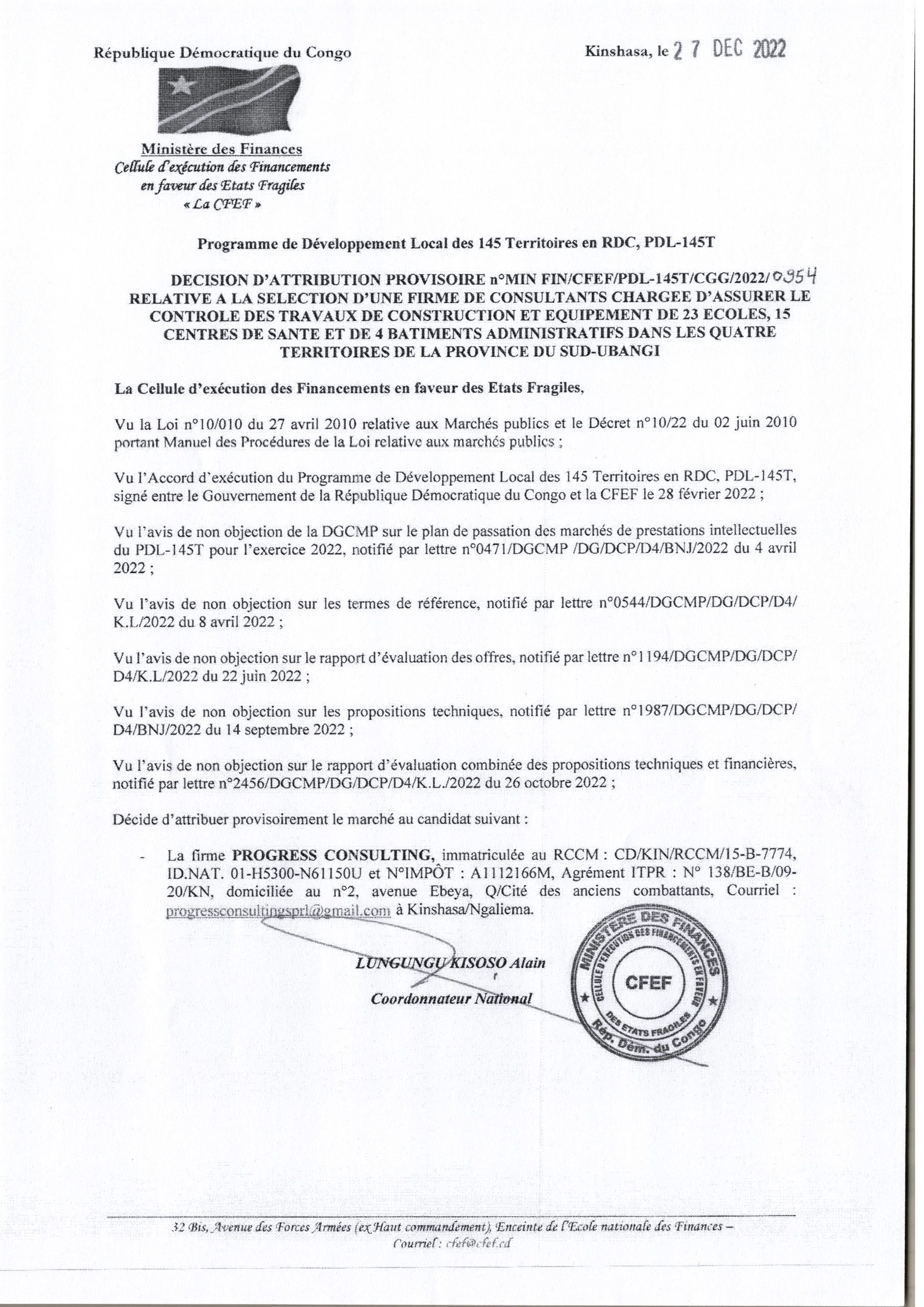 Attribution provisoire accordée à la firme PROGRESS CONSULTING relative à la sélection d’une firme de consultants chargée d’assurer le contrôle des travaux de construction et équipement de 23 écoles, 15 centres de santé et de 4 Bâtiments Administratifs dans les quatre Territoires de la province du Nord-Ubangi.