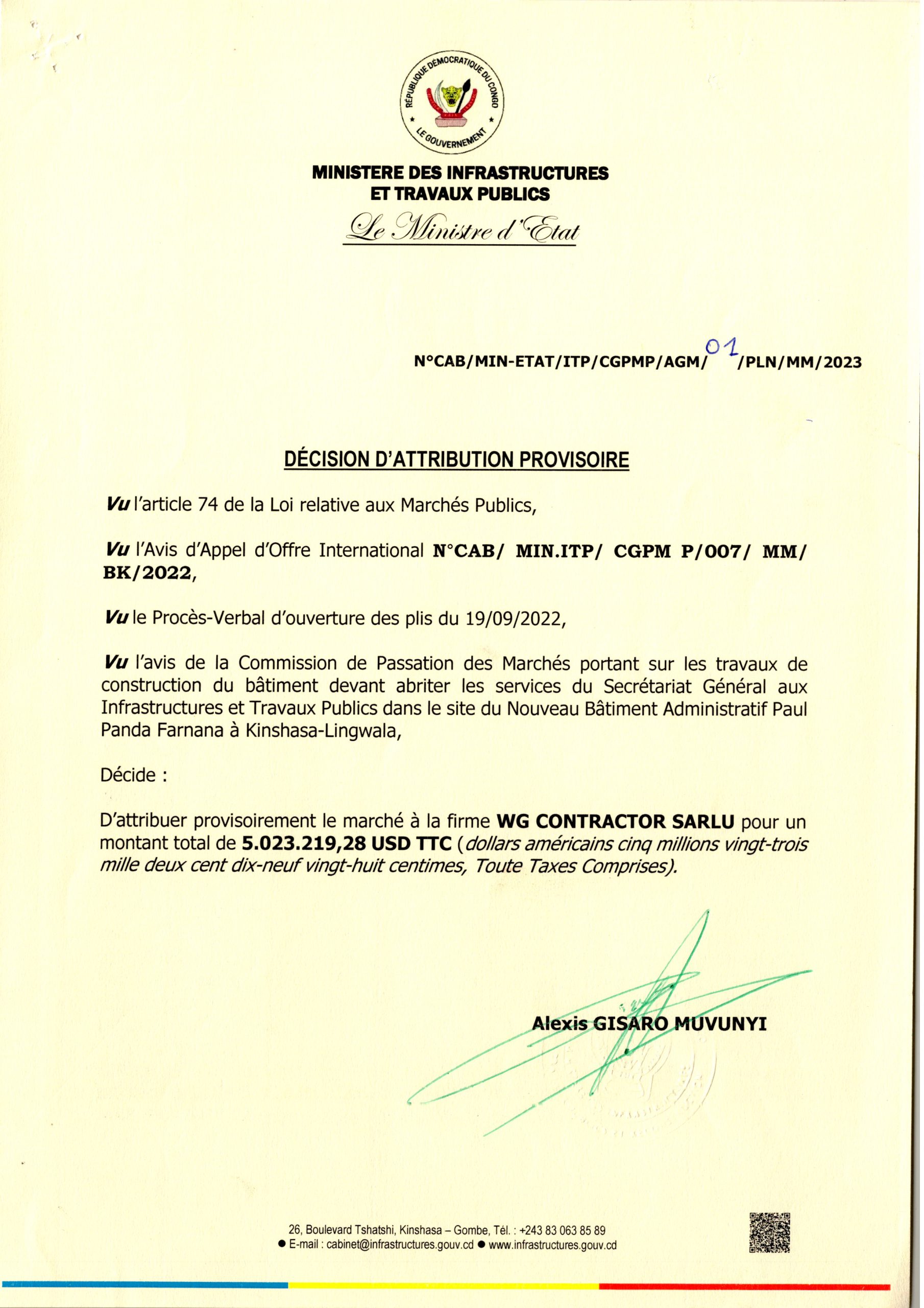 Décision d’attribution provisoire accordée à la firme WG CONTRACTOR SARLU relative aux travaux de construction du bâtiment devant abriter les services du secrétariat général aux infrastructures et travaux publics dans le site du nouveau bâtiment admin..