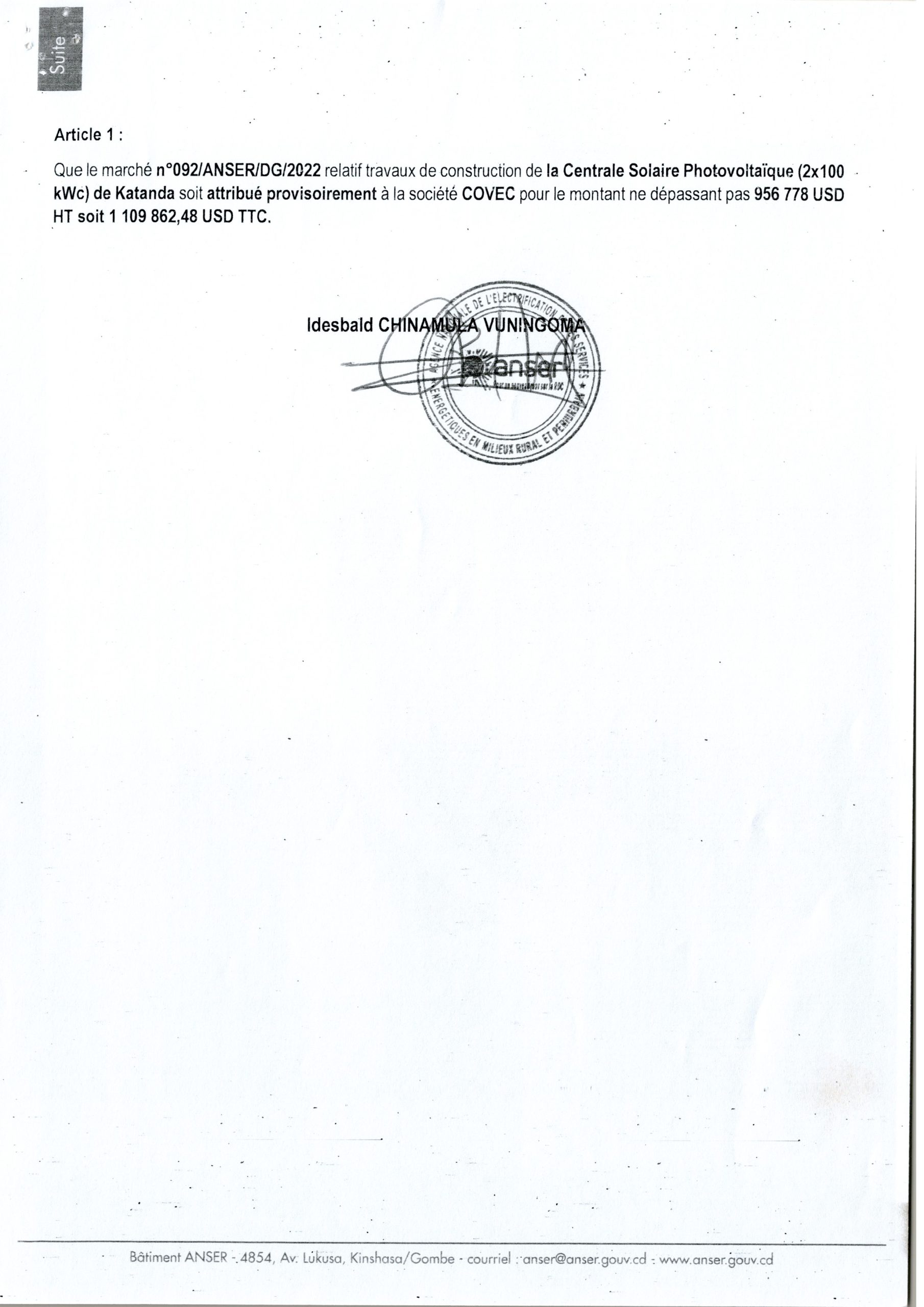 DÉCISION D’ATTRIBUTION PROVISOIRE ACCORDÉE À LA SOCIÉTÉ COVEC RELATIVE AUX TRAVAUX DE CONSTRUCTION DE LA CENTRALE SOLAIRE PHOTOVOLTAIQUE (2x100KWC) DE KATANDA.