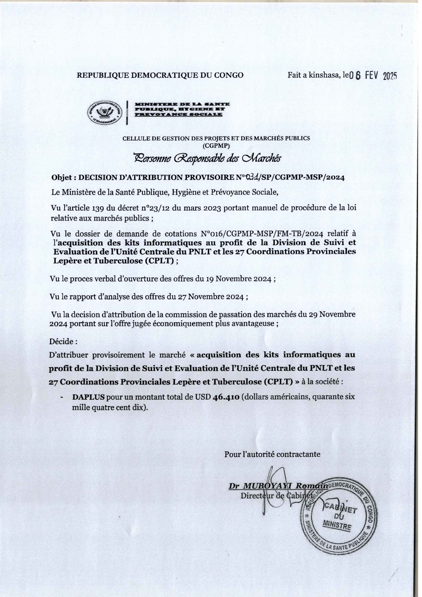 Attribution provisoire accordée à la Société DAPLUS relative à l’acquisition des Kits informatiques au profit de la Division de suivi et Evaluation de l’Unité Centrale du PNLT et les 27 Coordinations Provinciales Lepère et Tuberculose (CPLT).
