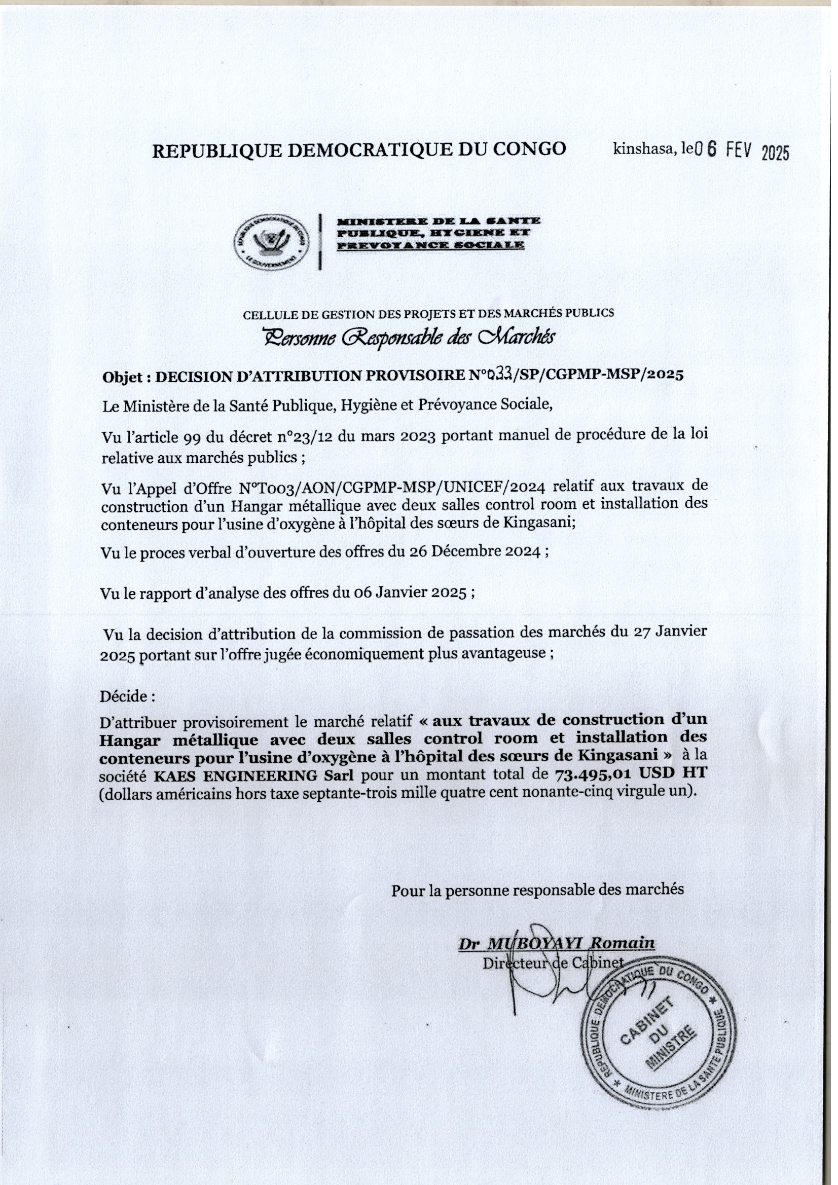 Décision d’attribution provisoire accordée à la Société KAES ENGINEERING Sarl relative aux travaux de construction d’un Hangar métallique avec deux salles control room et installation des conteneurs pour l’usine d’oxygène à l’hôpital des sœurs de Kingasani.