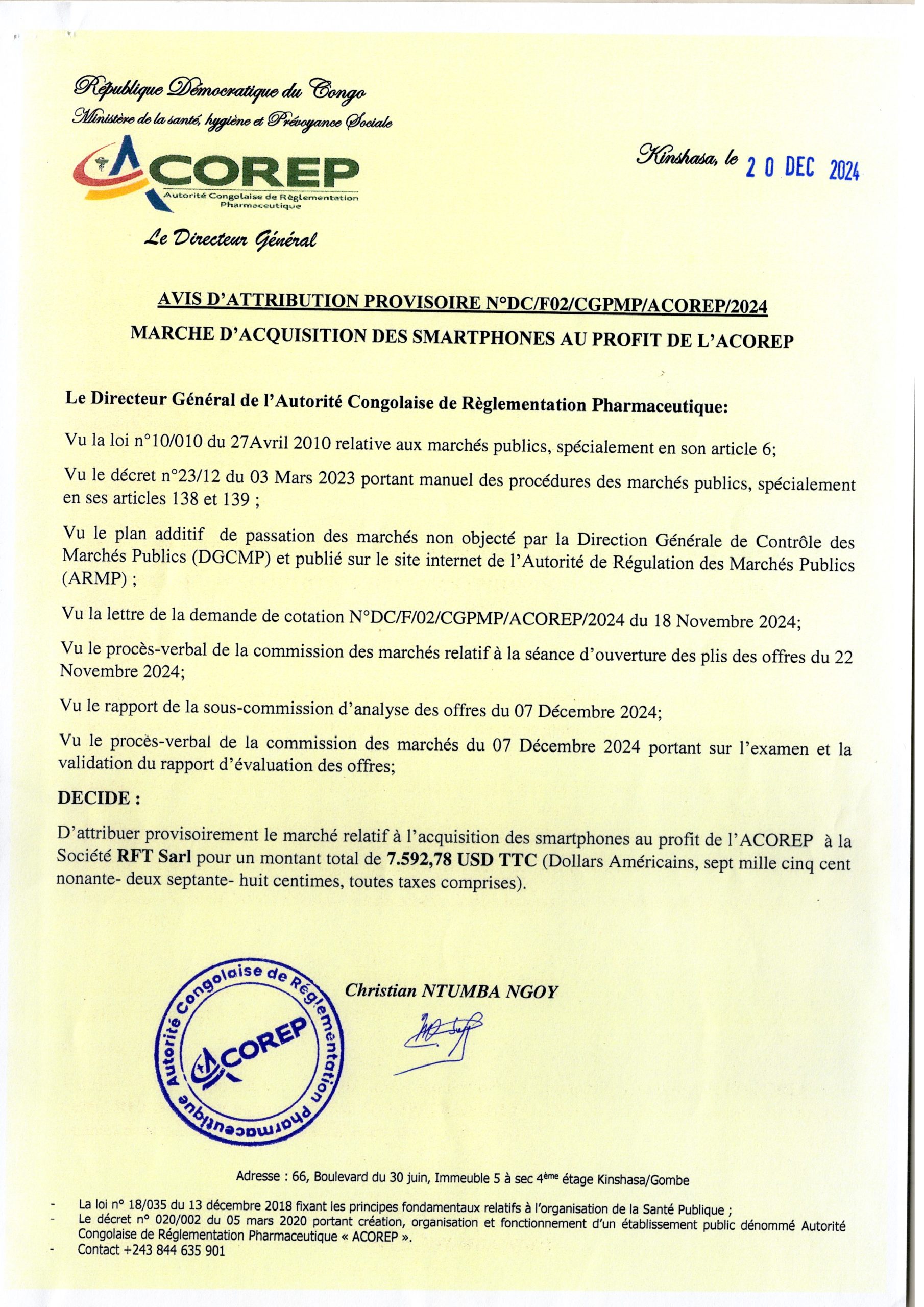 Attribution provisoire accordée à la société RFT relative à l’acquisition des Smartphones au profit de l’ACOREP.