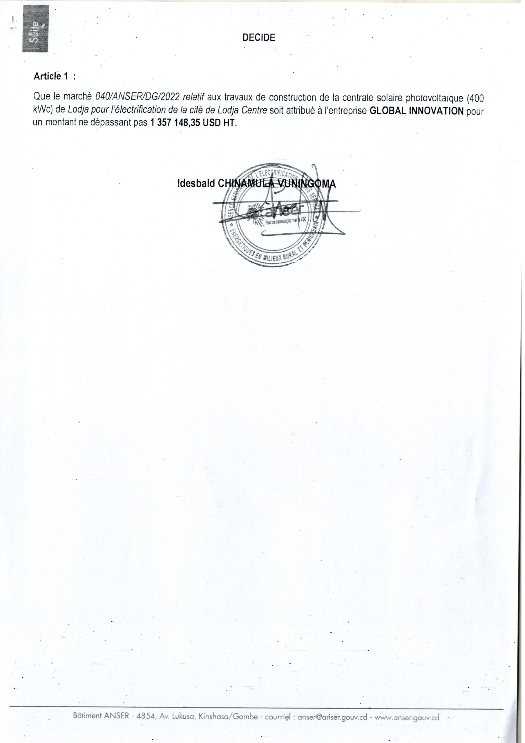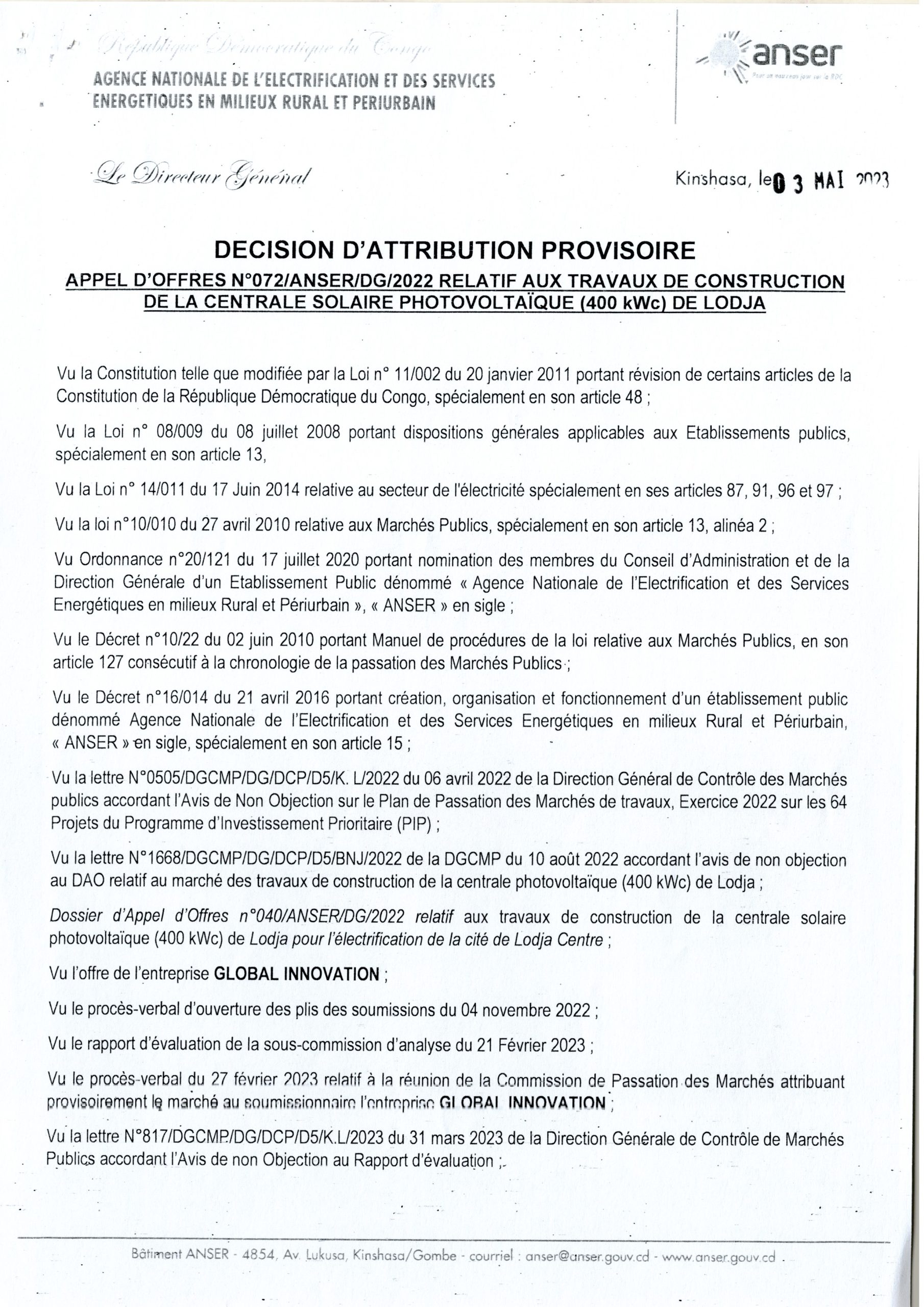 DÉCISION D’ATTRIBUTION PROVISOIRE ACCORDÉE À L’ENTREPRISE GLOBAL INNOVATION RELATIVE AUX TRAVAUX DE CONSTRUCTION DE LA CENTRALE SOLAIRE PHOTOVOLTAIQUE (400 KWC) DE LODJA POUR L’ ÉLECTRIFICATION DE LA CITÉ DE LODJA CENTRE.