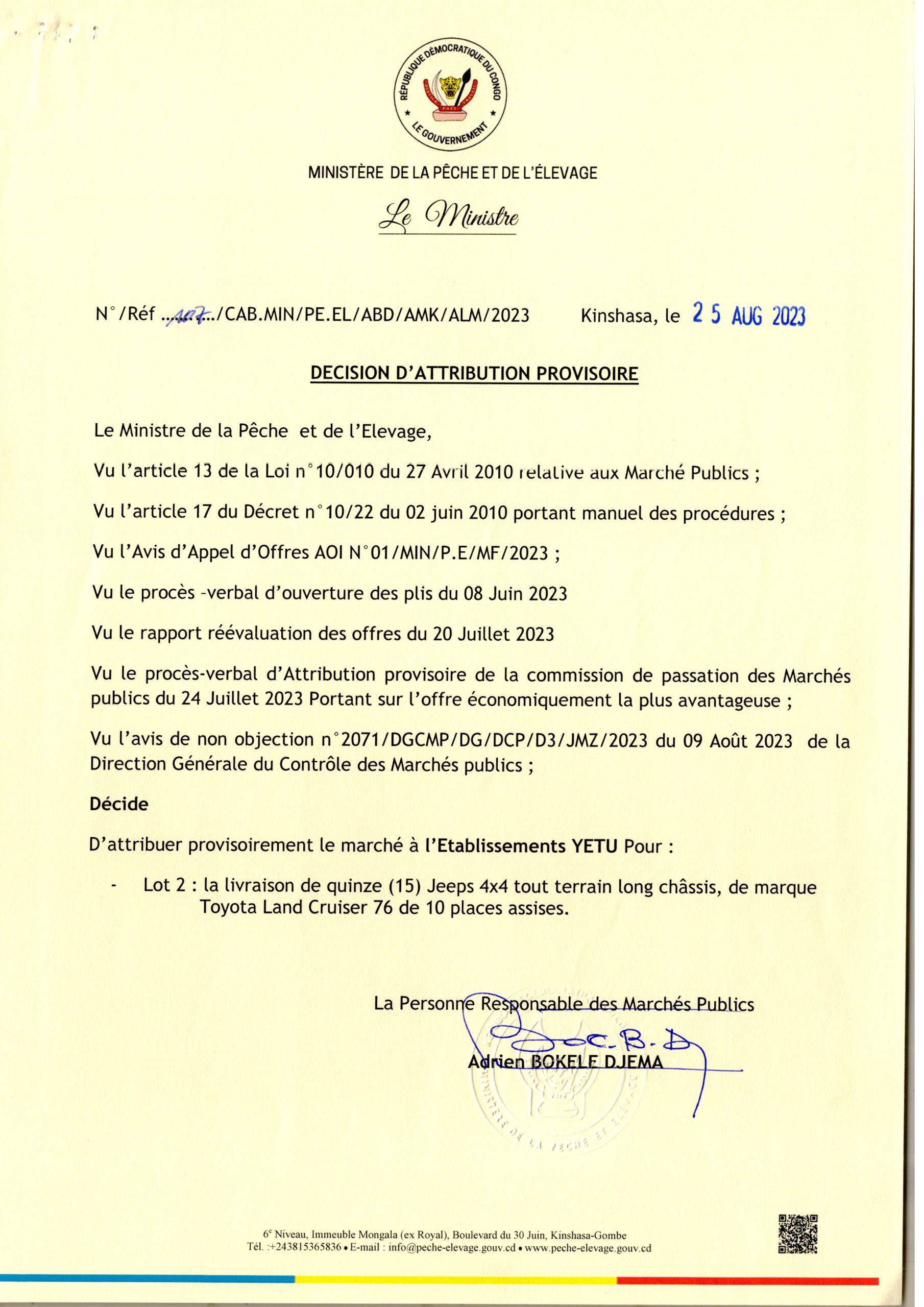ATTRIBUTION PROVISOIRE ACCORDÉE À L’ETABLISSEMENT YETU RELATIVE À LA LIVRAISON EN LOT 2: DE QUINZE (15) JEEPS 4X4 TOUT TERRAIN LONG CHÂSSIS, DE MARQUE TOYOTA LAND CRUISER 76 DE 10 PLACES ASSISES.