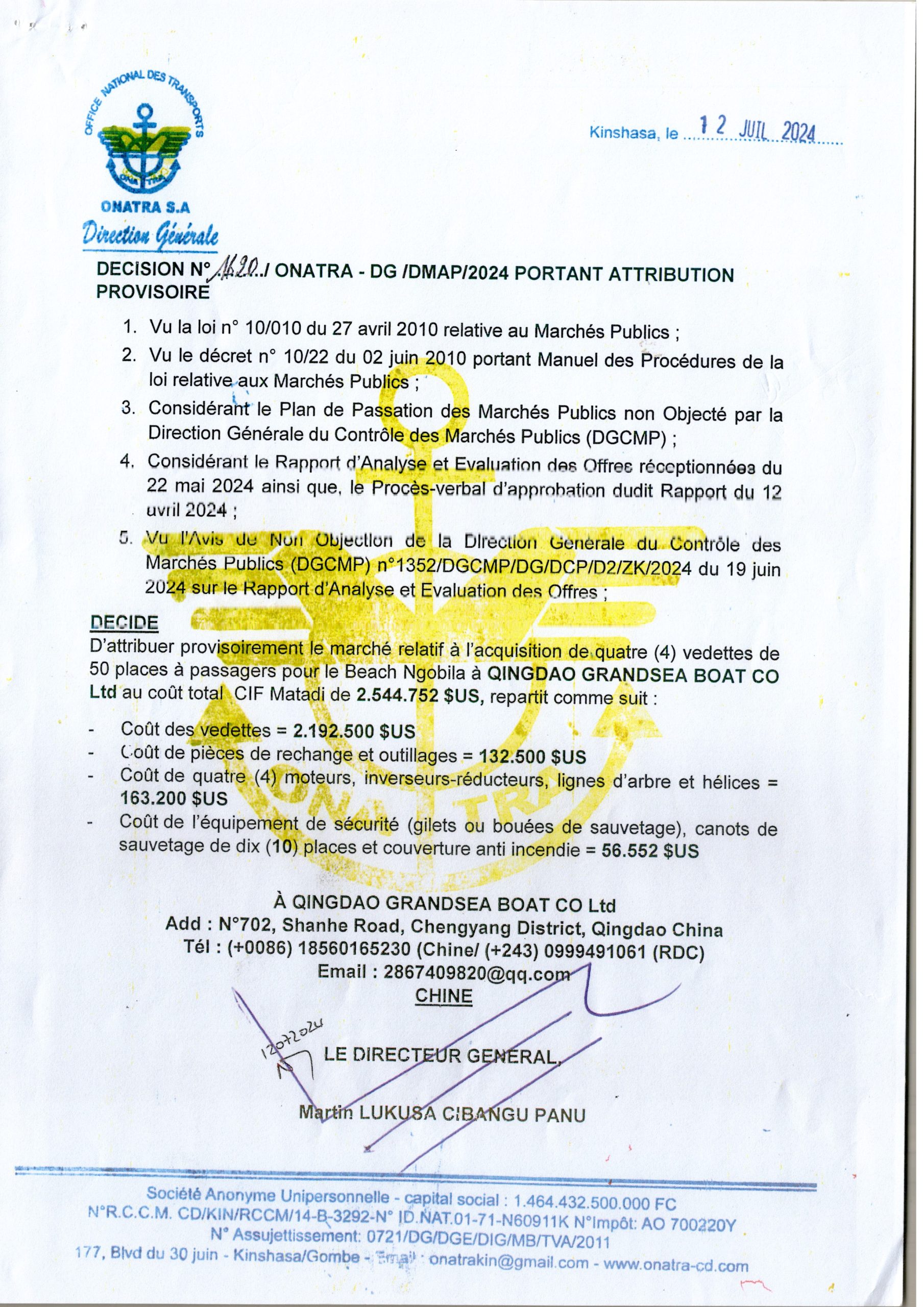 Avis d’attribution provisoire accordée À QINGDAO GRANDSEA BOAT CO relative à l’acquisition de quatre (4) vedettes de 50 places à passagers pour le BEACH NGOBILA.