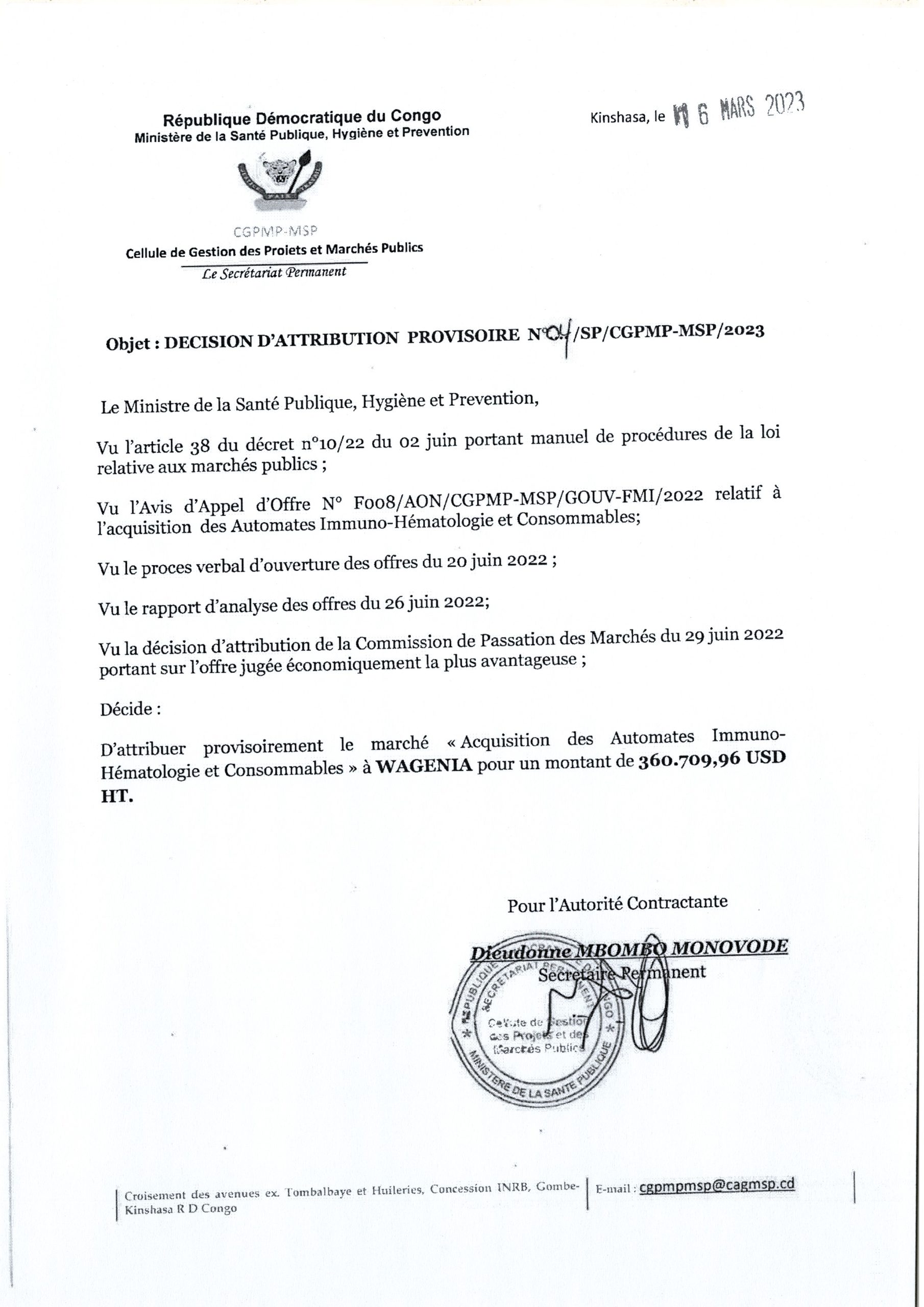 Attribution provisoire accordée à WAGENIA marché relative à l’acquisition des Automates Immuno- Hématologie et Consommables.
