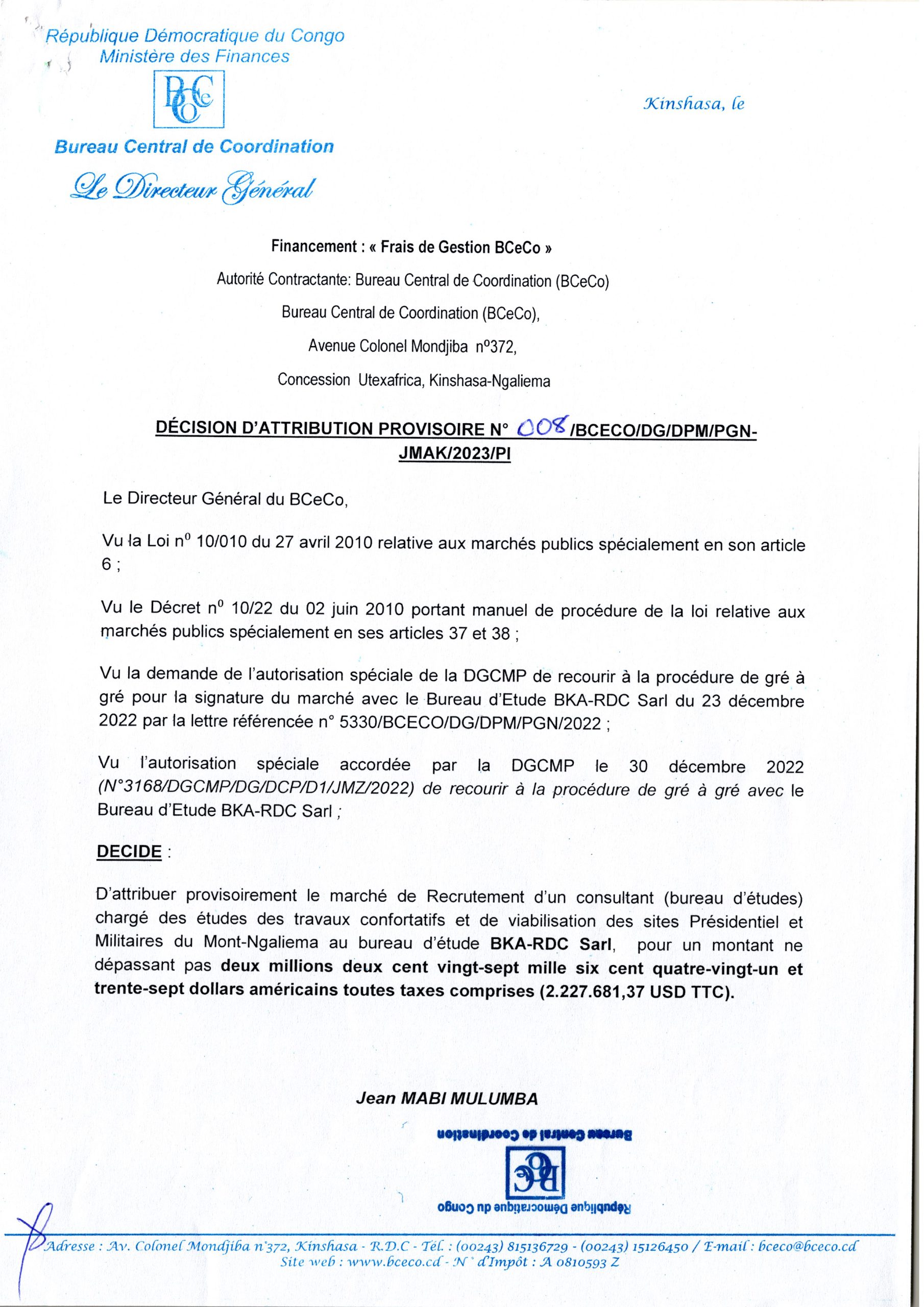 Attribution provisoire accordée au Bureau d’Etude BKA-RDC relative au recrutement d’un consultant ( bureau d’études) chargé des études des travaux confortatifs et de viabilisation des sites Présidentiel et Militaires du Mont-Ngaliema.