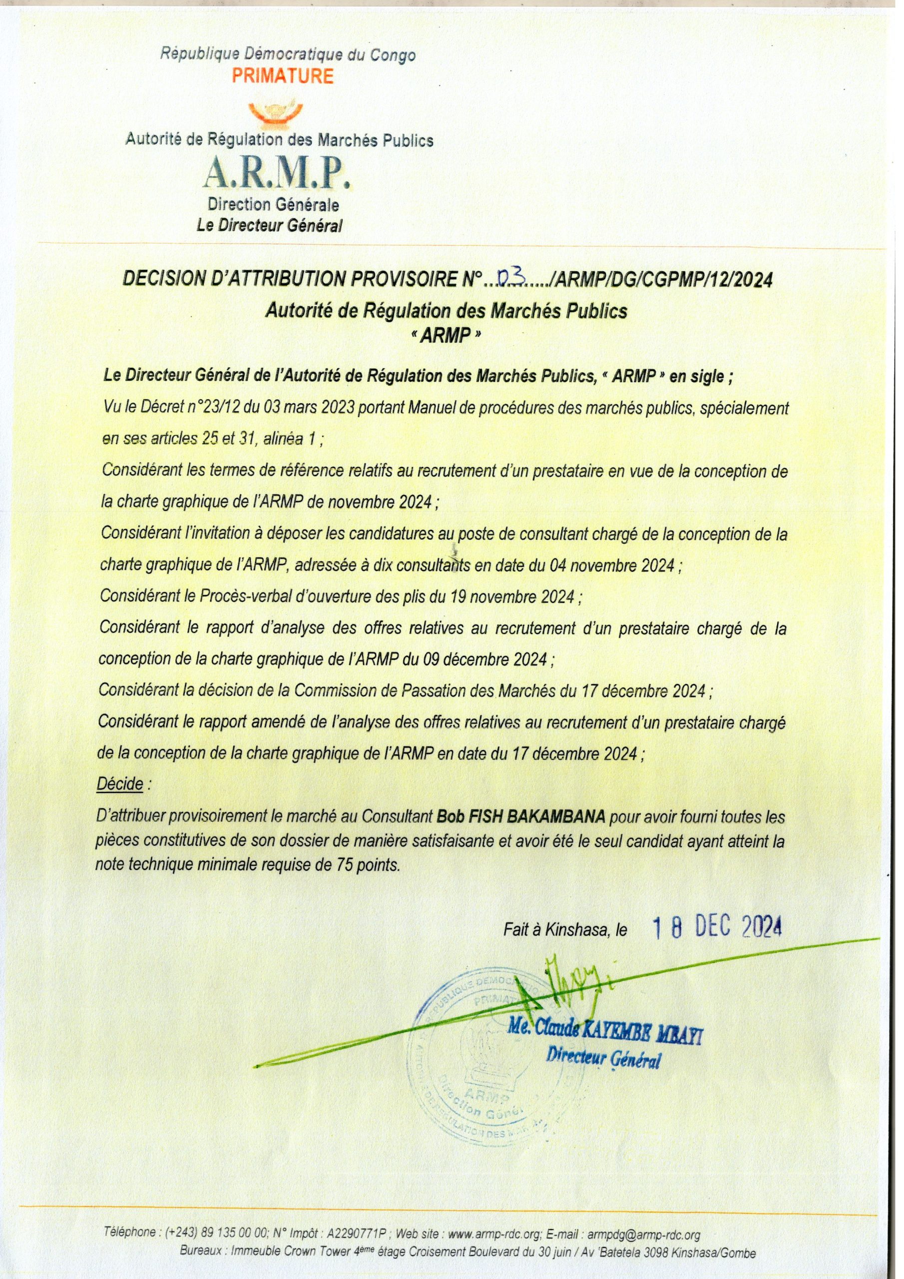 Attribution provisoire accordée au consultant Bob FISH BAKAMBANA relative au recrutement d’un prestataire en vue de la conception de la charte graphique de l’ARMP.