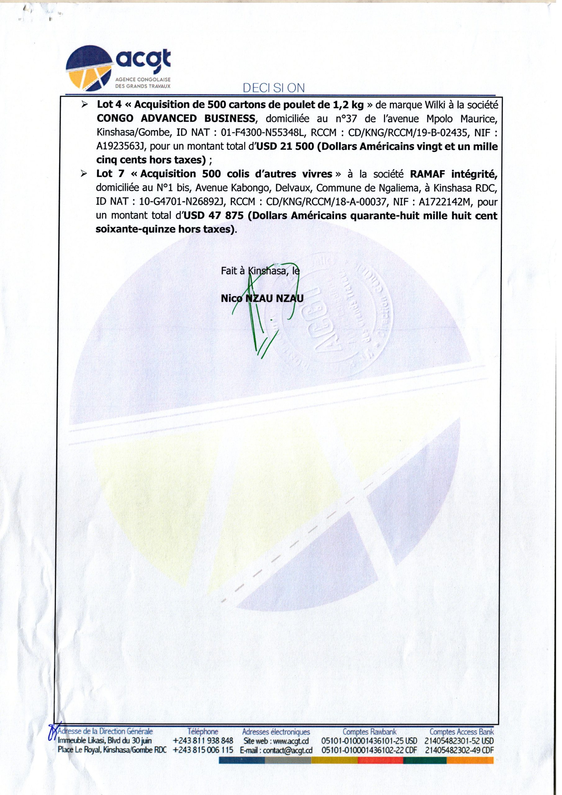 Attribution provisoire accordée aux Sociétés (lot 1,2,3,5et 6 AFRI-FOOD, lot 4 CONGO ADVANCED BUSINESS et lot 7 RAMAF intégrité) marché relative à l’acquisition des vivres de fin d’année 2024.